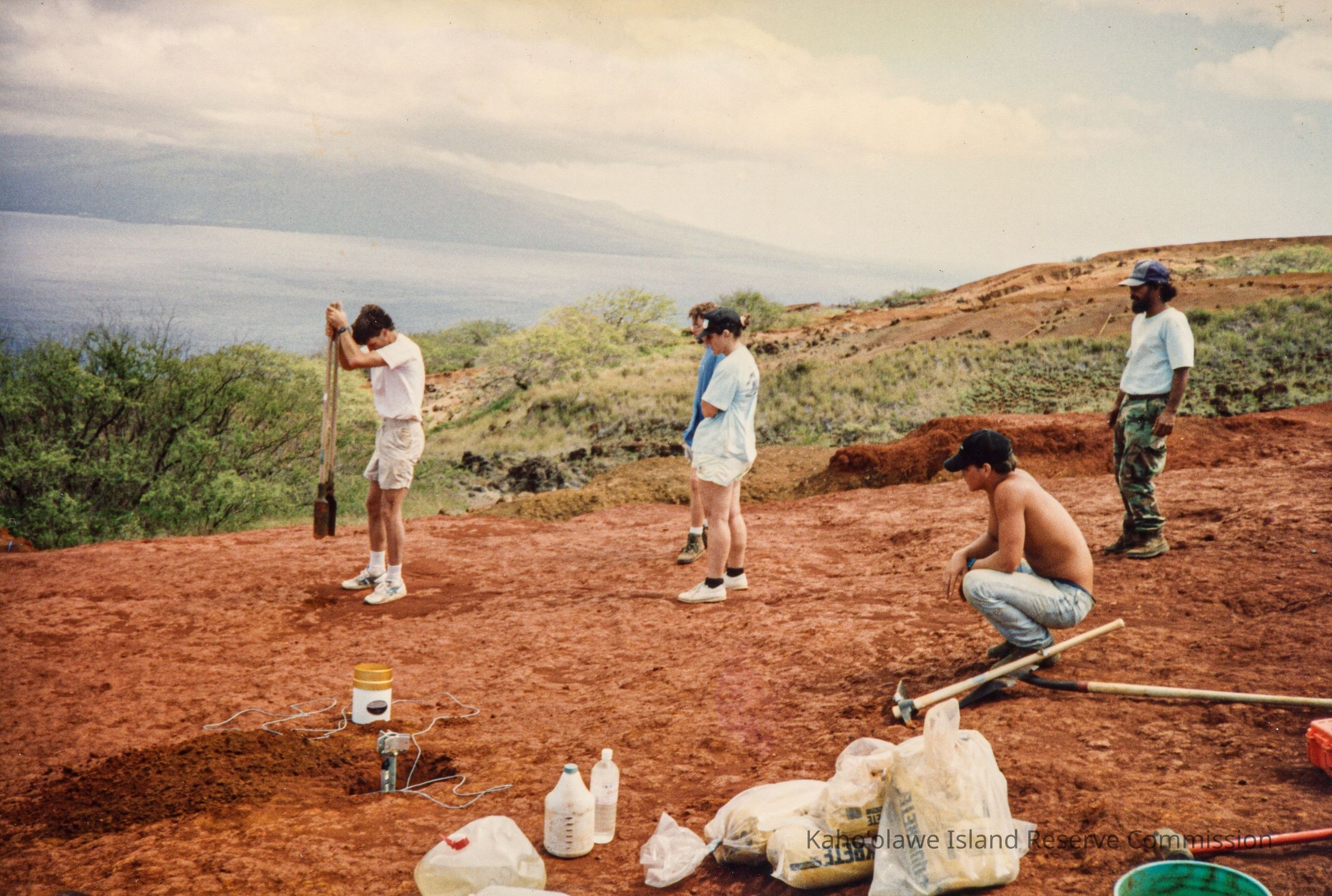 Color photograph of a group of unidentified people on hardpan terrain. One kāne (man) is operating a pot-hole digger while several people look on. There are scientific equipment and several bags and bottles along with a pick axe in the forefront.