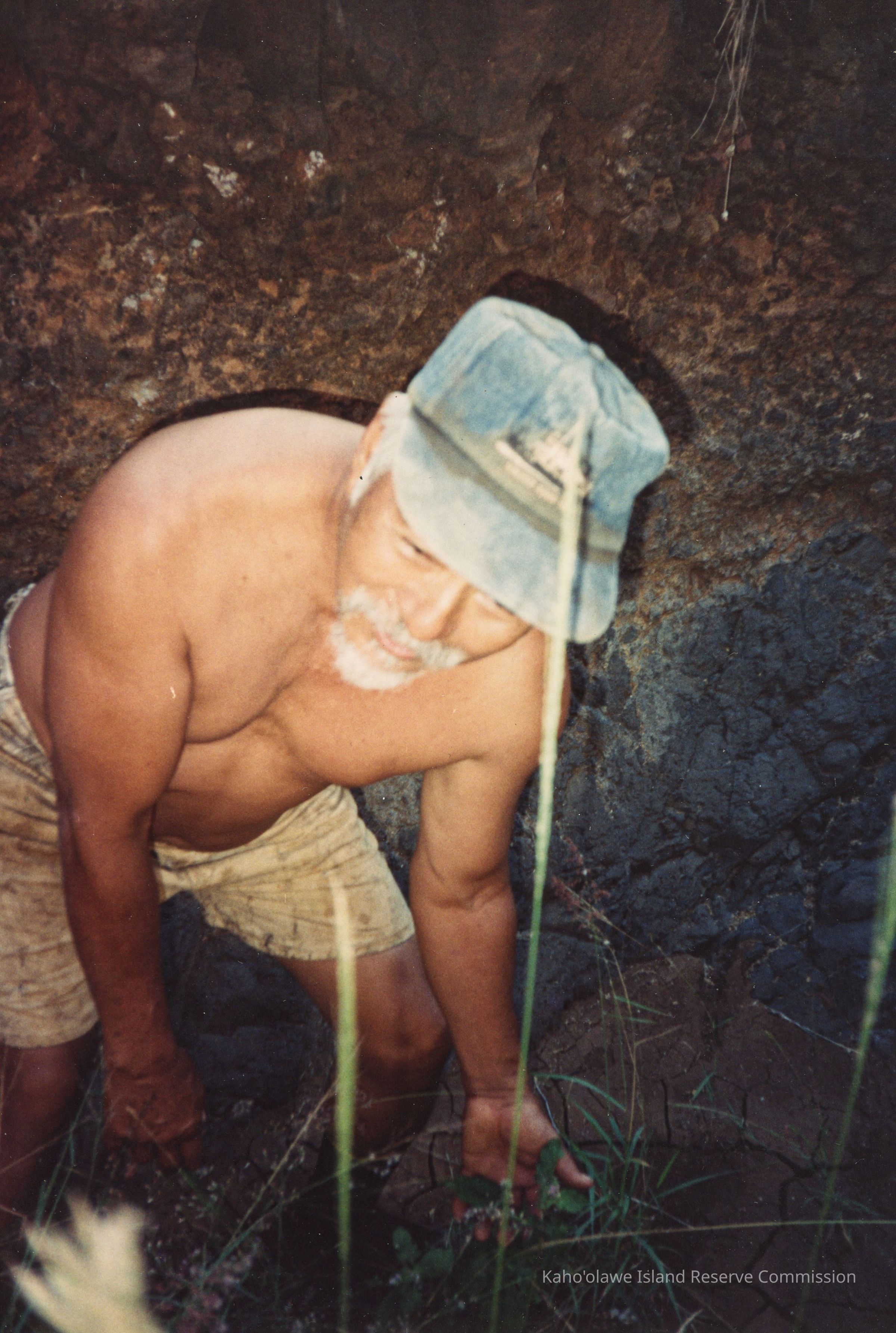 A shirtless man wearing a cap kneels in front of a rocky surface while surrounded by sparse vegetation in a rugged outdoor setting.
