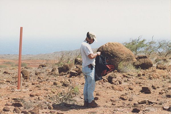 Color photo of an unidentified man handling a black bag with orange print in an unidentified area. An orange boundary marker stands to the left and the ocean is in the background.Collection