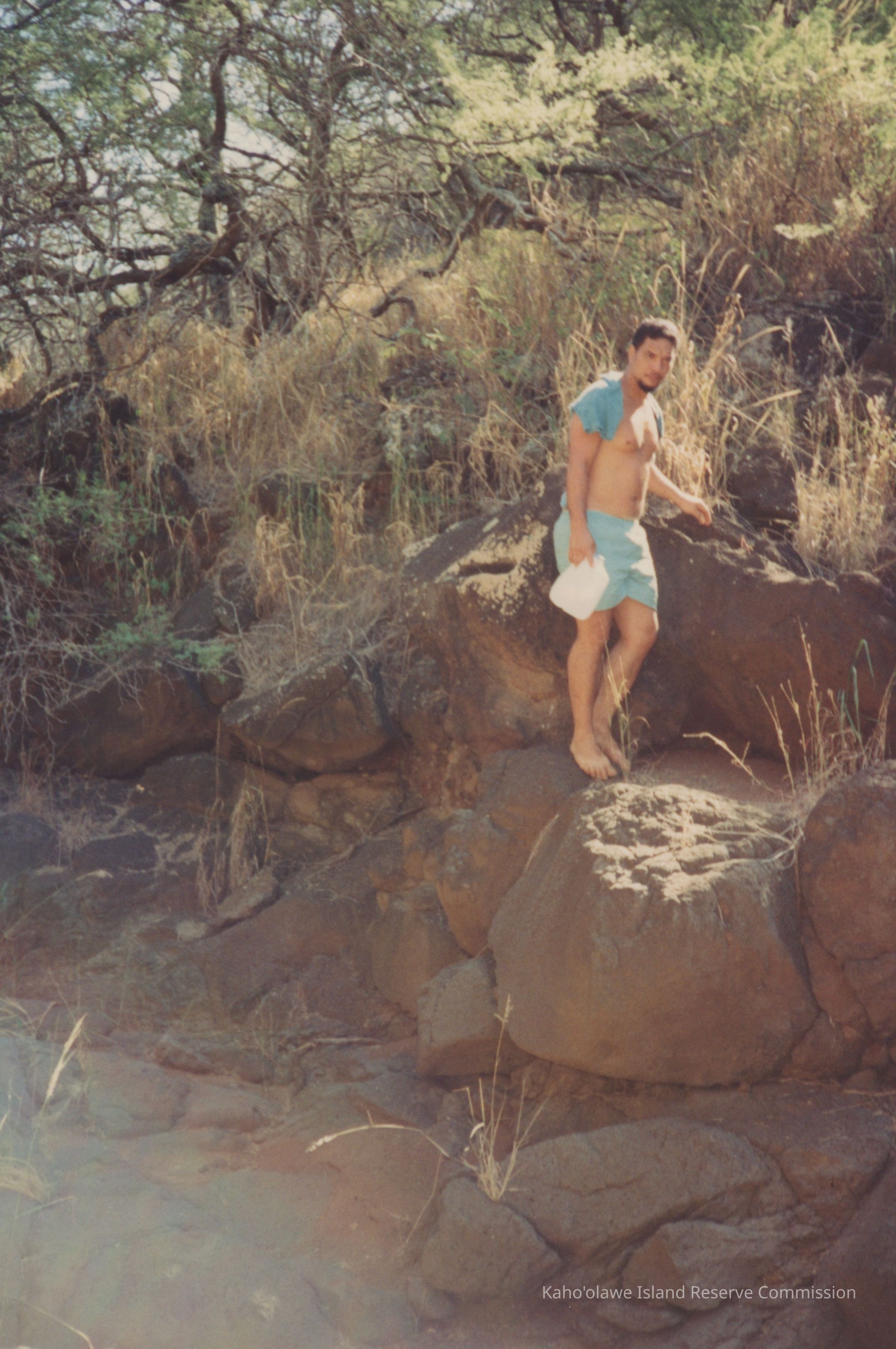 A man stands barefoot on rocky terrain, holding a white jug, surrounded by dry grass and trees.