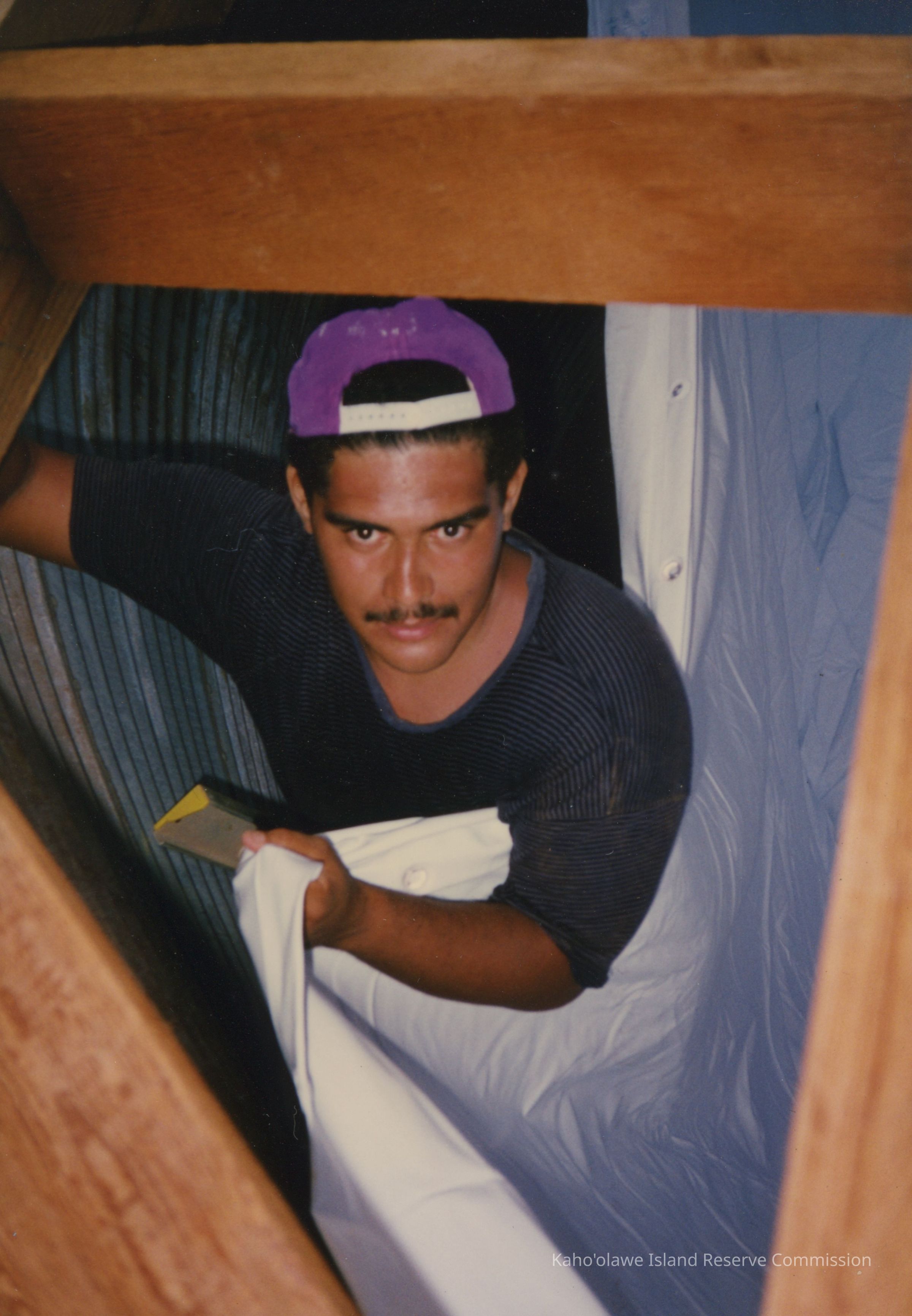 A person is inside a water tank structure, wearing a purple cap backward, holding a white material and a tool, and surrounded by wooden beams.