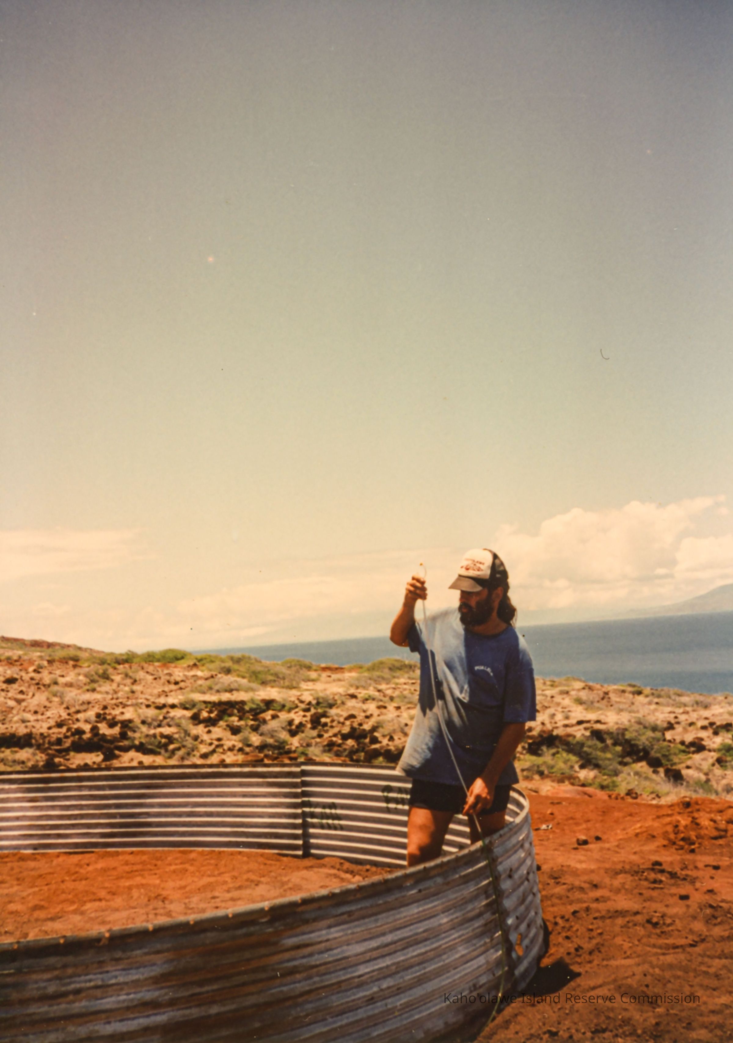 Color photo of an unidentified man making a measurement at the base of a metal water catchment structure. This photo may have been taken at Wailuna in Hakioawa 'Ili.