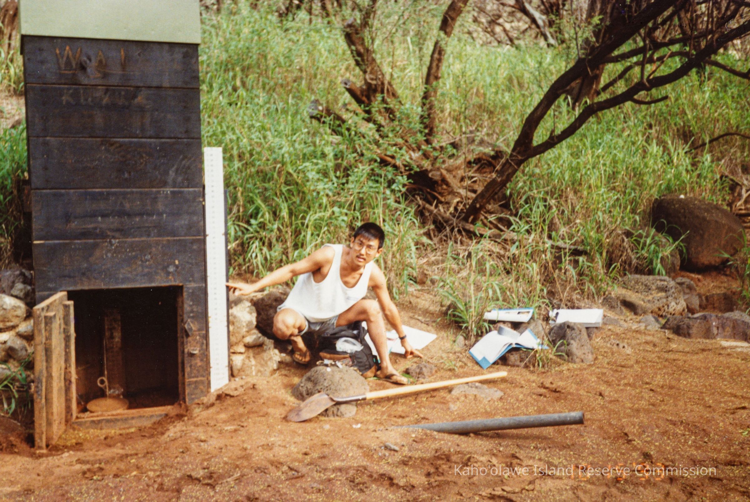 Color photograph of an unidentified man pointing to the high water mark of the last flow (according to handwritten note on page in the original photo album) on a water gage. This gage is attached to a wooden structure with a weight inside. There are a shovel, pipe and notebooks next to the man.Photograph Details