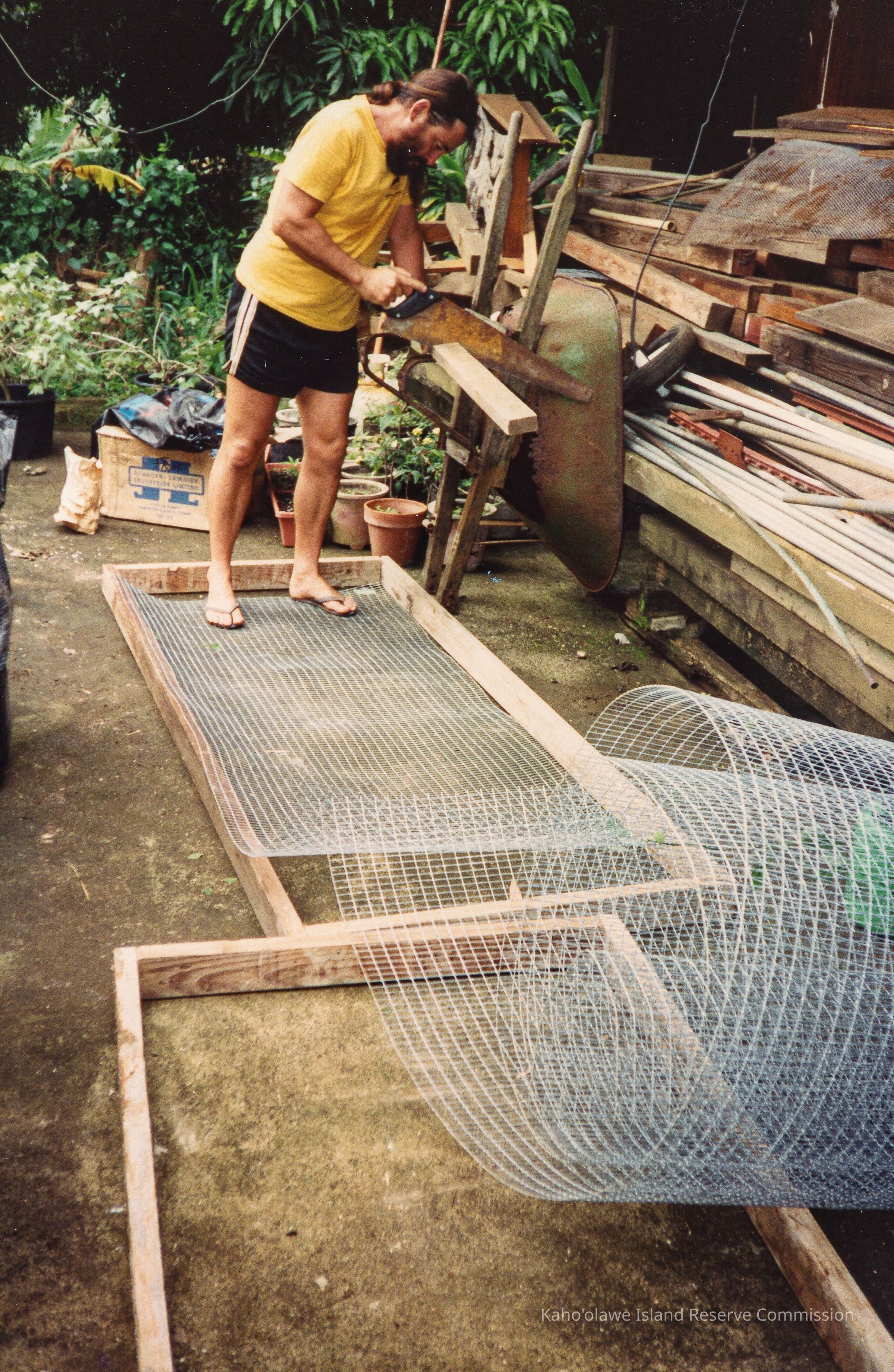 Color photo of a man (possibly Dan Holmes) sawing a piece of wood while standing on chicken wire next to a shed. Photo taken at Paul Higashino's residence.