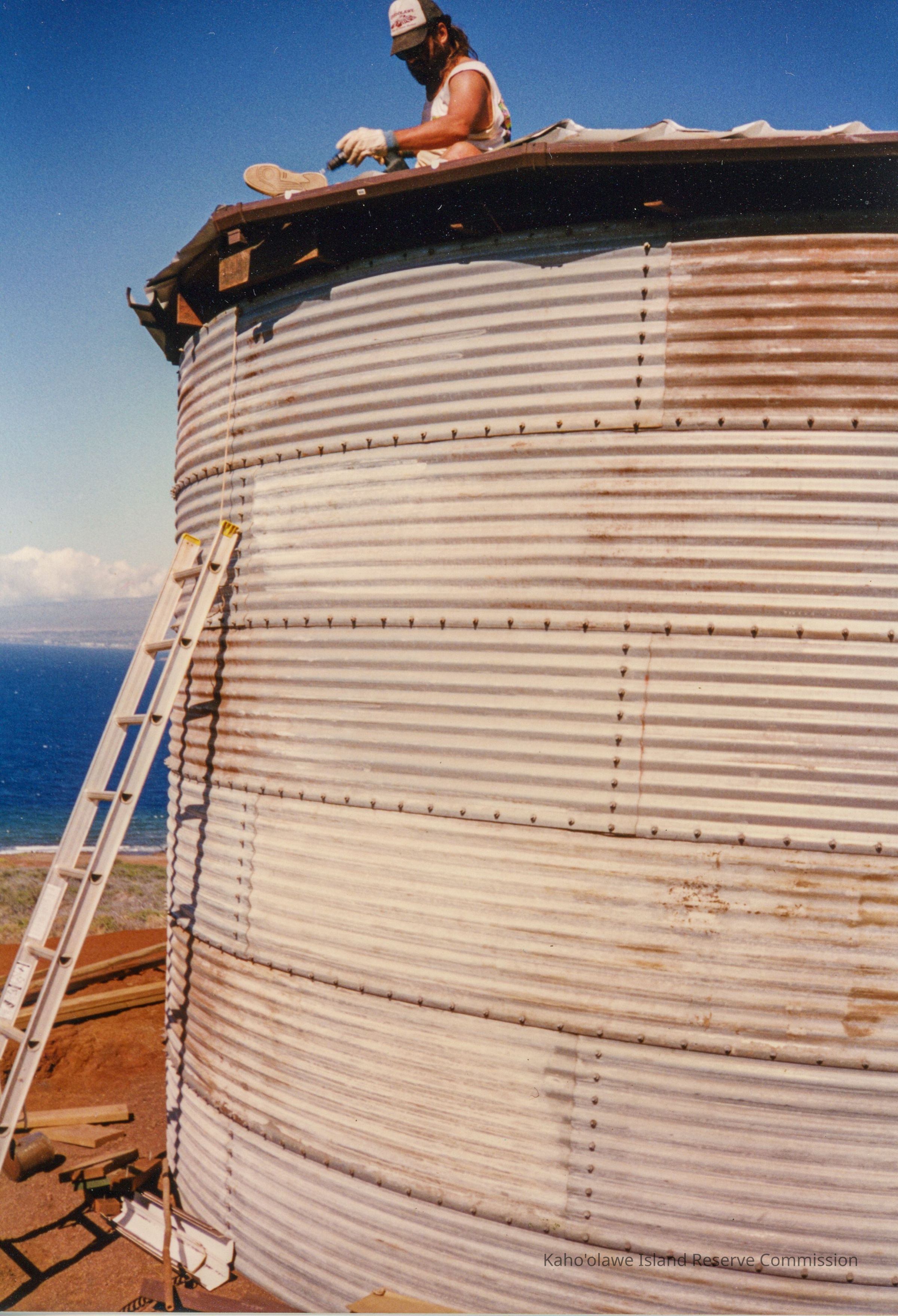 Color photograph of an unidentified man sitting and working on the top of a water tank situated on hardpan terrain.