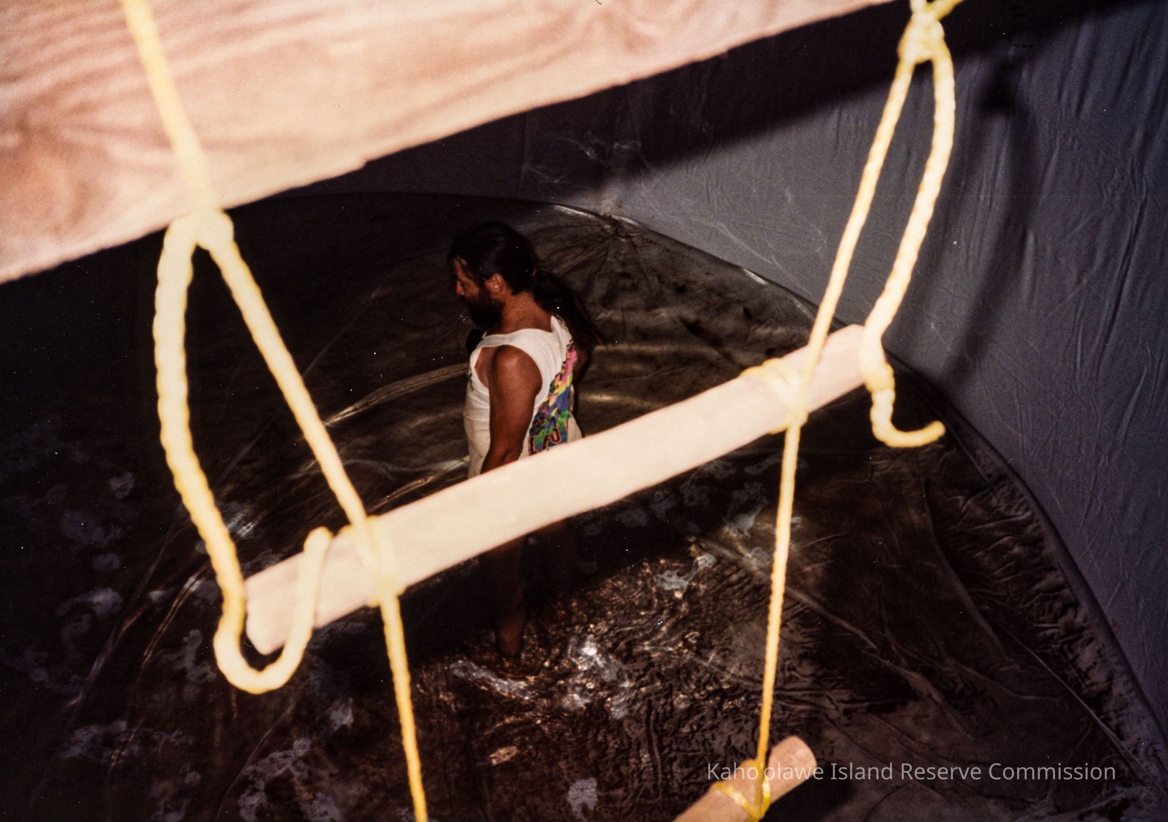 Color photograph of a man (possibly Dan Holmes) standing in water at the bottom of a lined water tank. There is a rope ladder in the forefront.