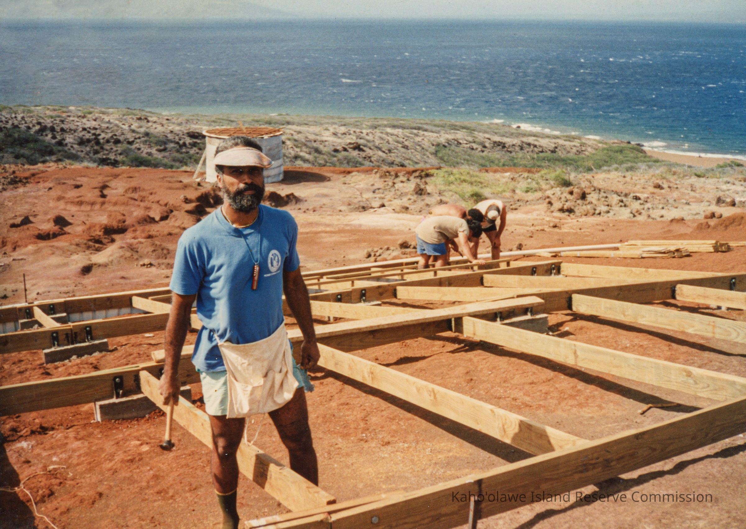 Color photograph of an unidentified man standing within a wooden frame base for a water catchment structure holding a hammer. There are three unidentified people working on the frame in the background.