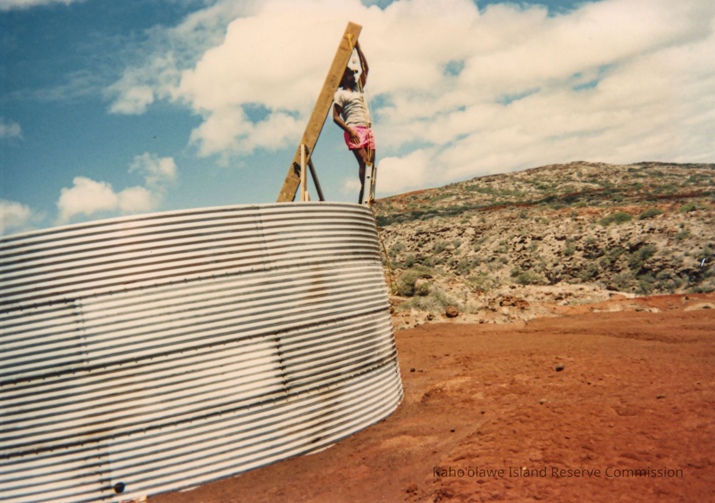 Color photo of an unidentified man standing on a ladder in a partially constructed circular corrugated metal water catchment on hardpan terrain. He is holding a wooden plank. This photo was probably taken during the 1993 PKO (Protect Kaho'olawe 'Ohana) access to build a water catchment at Wailuna in Hakioawa 'Ili.