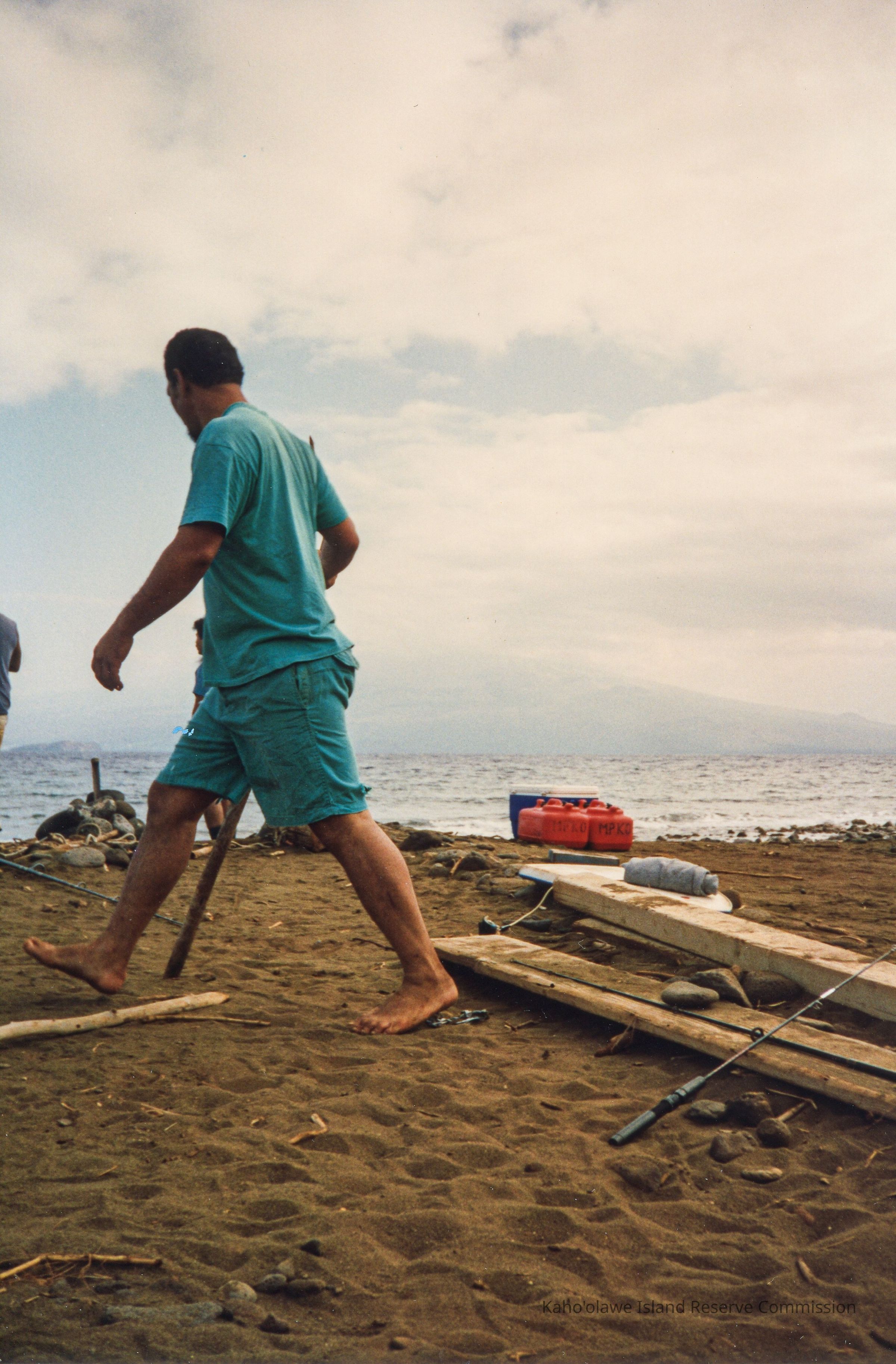 Color photograph an unidentified man walking on a sandy beach in profile. Planks of wood and orange containers are sitting on the beach. The photograph was probably taken at Hakioawa Beach.