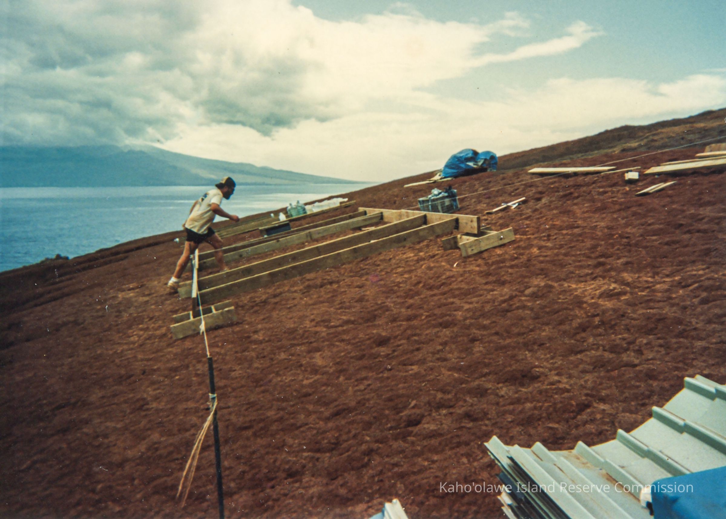 Color photo a unidentified bearded man wearing a cap backwards walking over a wooden frame on hardpan terrain. There are piles of construction material nearby. The ocean and Maui are in the far background. This photo was probably taken in Wailuna in Hakioawa 'Ili.