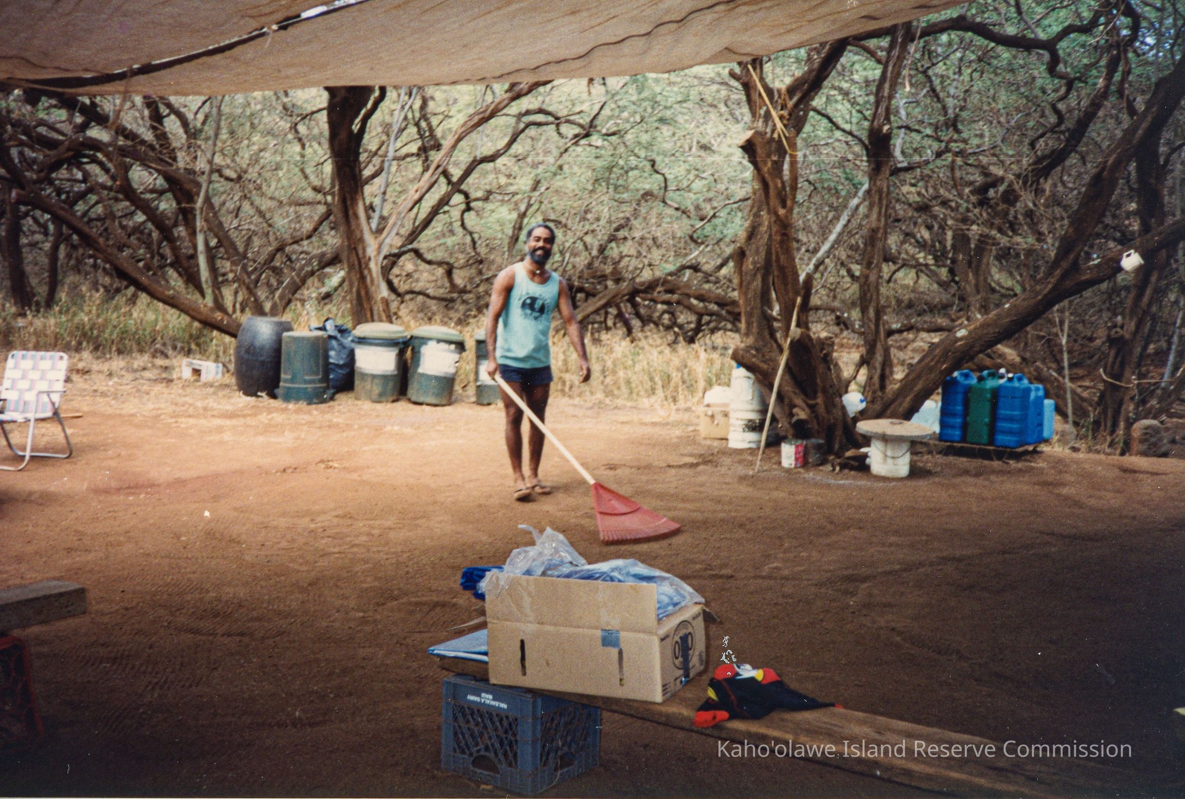 Color photograph if an unidentified man holding a rake and smiling at the camera. He is standing under a shelter consisting of tarps tied to kiawe trees. There several containers scattered throughout. This photograph may have been taken in Hakioawa.
