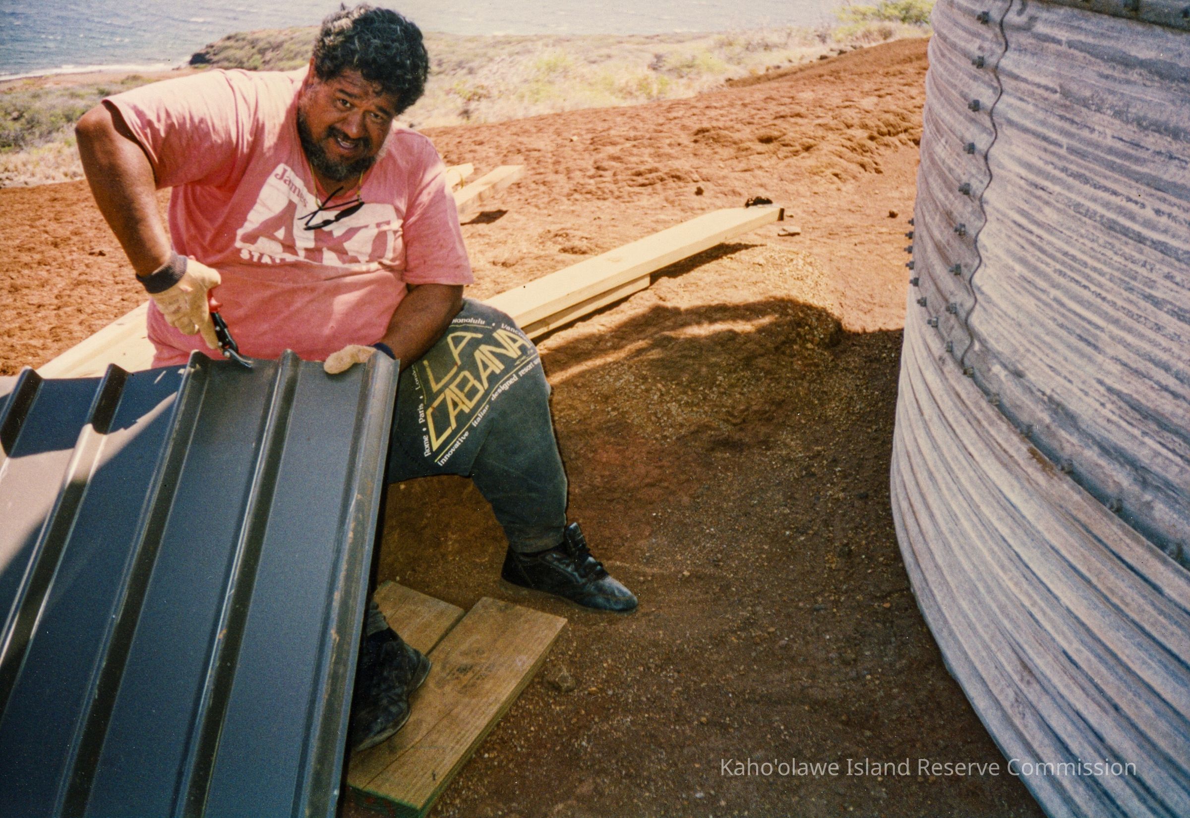 Color photograph of an unidentified man working on metal siding at a water catchment tank site on hardpan terrain.