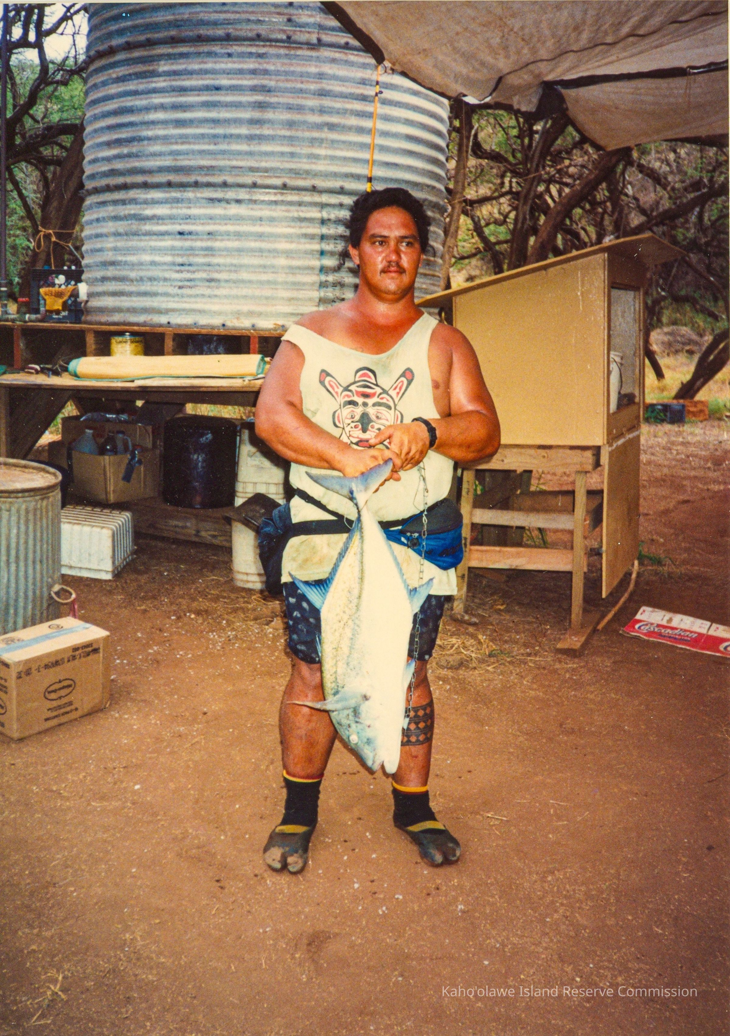 Mark Tsuha holding an 'omilu (bluefin trevally) near a water catchment structure and wooden cabinet. This photo may have been taken at Wailuna in Hakioawa 'Ili.