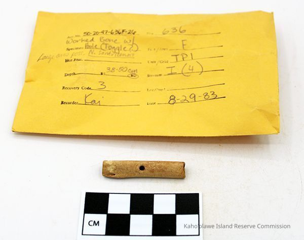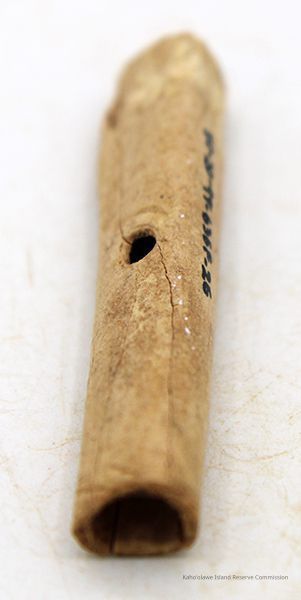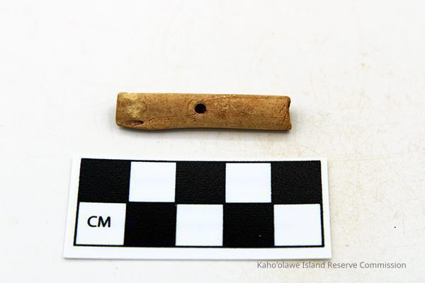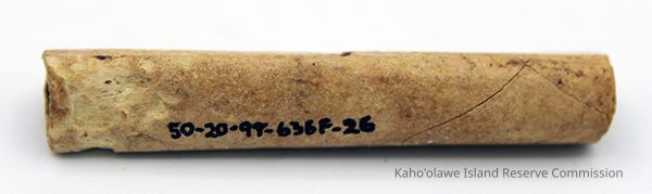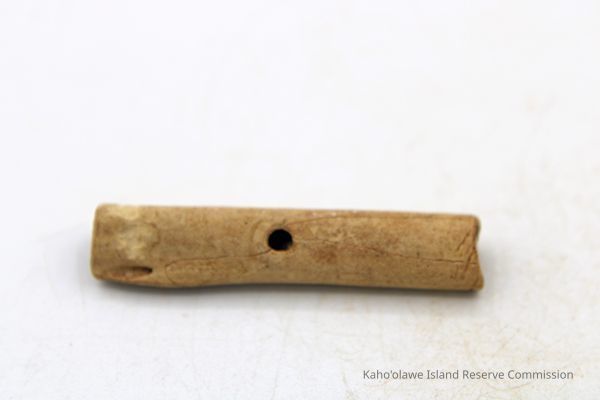 Worked bird bone, finished at both ends. It is hollow with a hole through opposite sides. It was broken into seven pieces and were glued together in the lab. The bone may be from nene (Branta sandvicensis/Nesochen sandvicensis).Collection