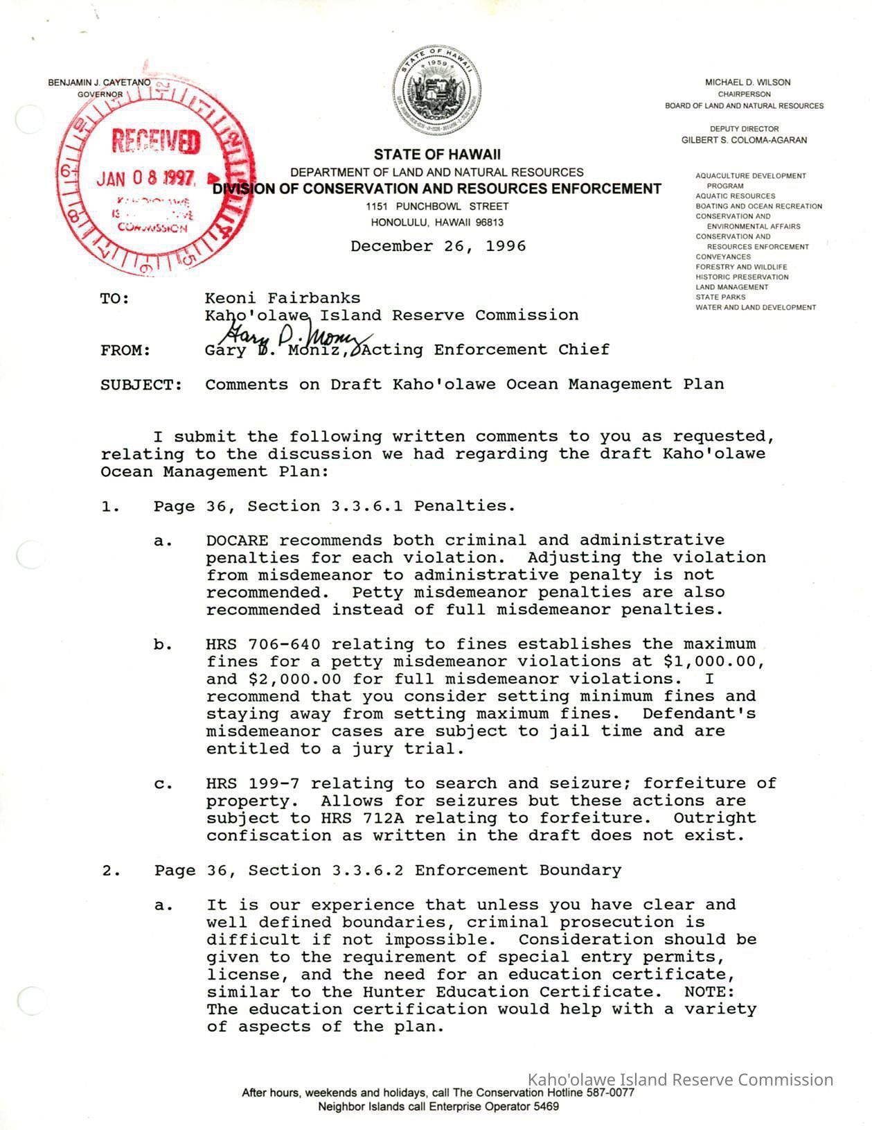 Original memo to Keoni Fairbanks, Kahoolawe Island Reserve Commission from Gary D. Moniz, Acting Enforcement Officer, Division of Conservation and Resources Enforcement, Department of Land and Natural Resources regarding comments on DKOMP. 3 printed letter sized pages on letterhead.Creator