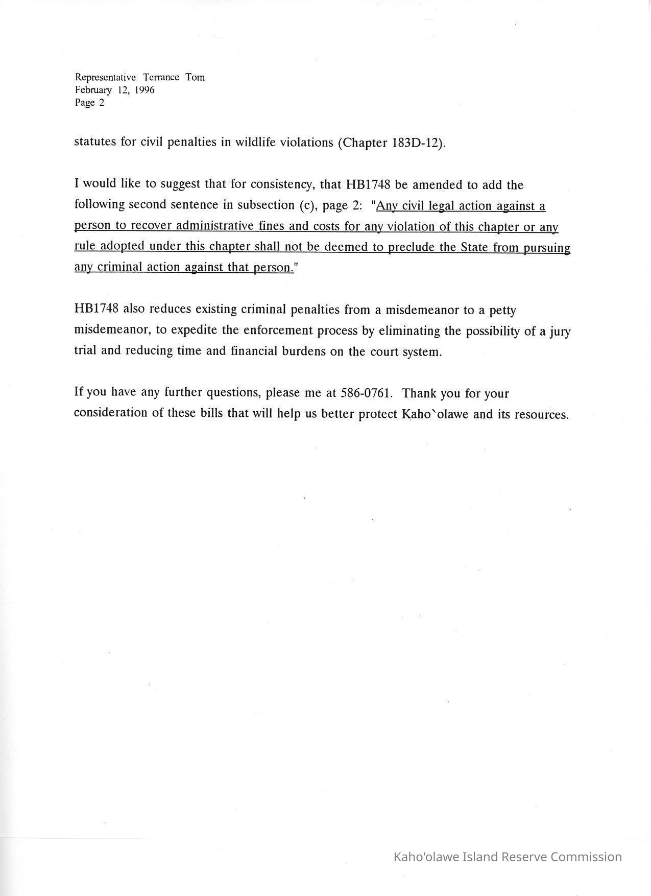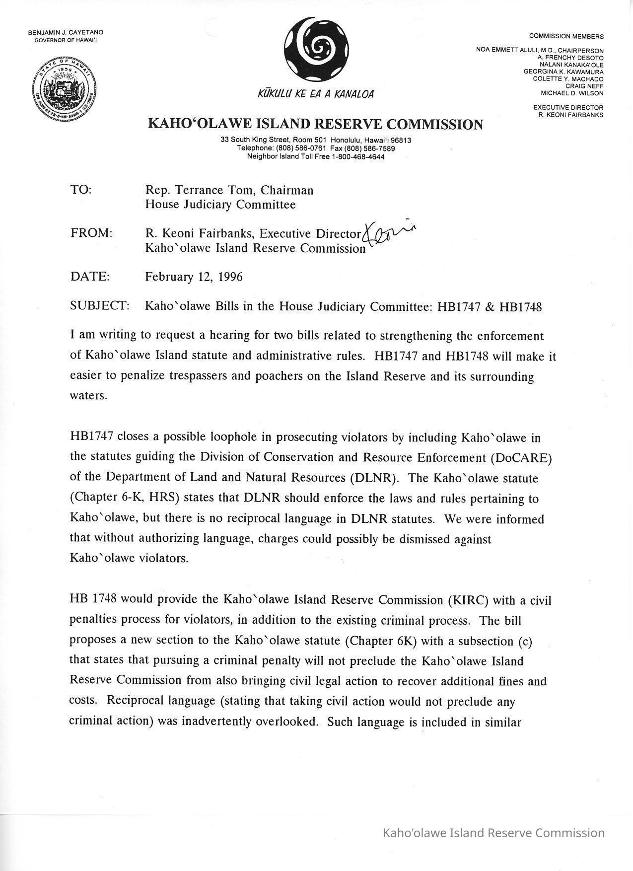 Memo to Rep. Terrance Tom, Chairman, House Judiciary Committee, from R. Keoni Fairbanks, Executive Director,Kaho'olawe Island Reserve Commission re: Kaho'olawe Bills in the House Judiciary Committee: HB1747 & HB1748.Creator