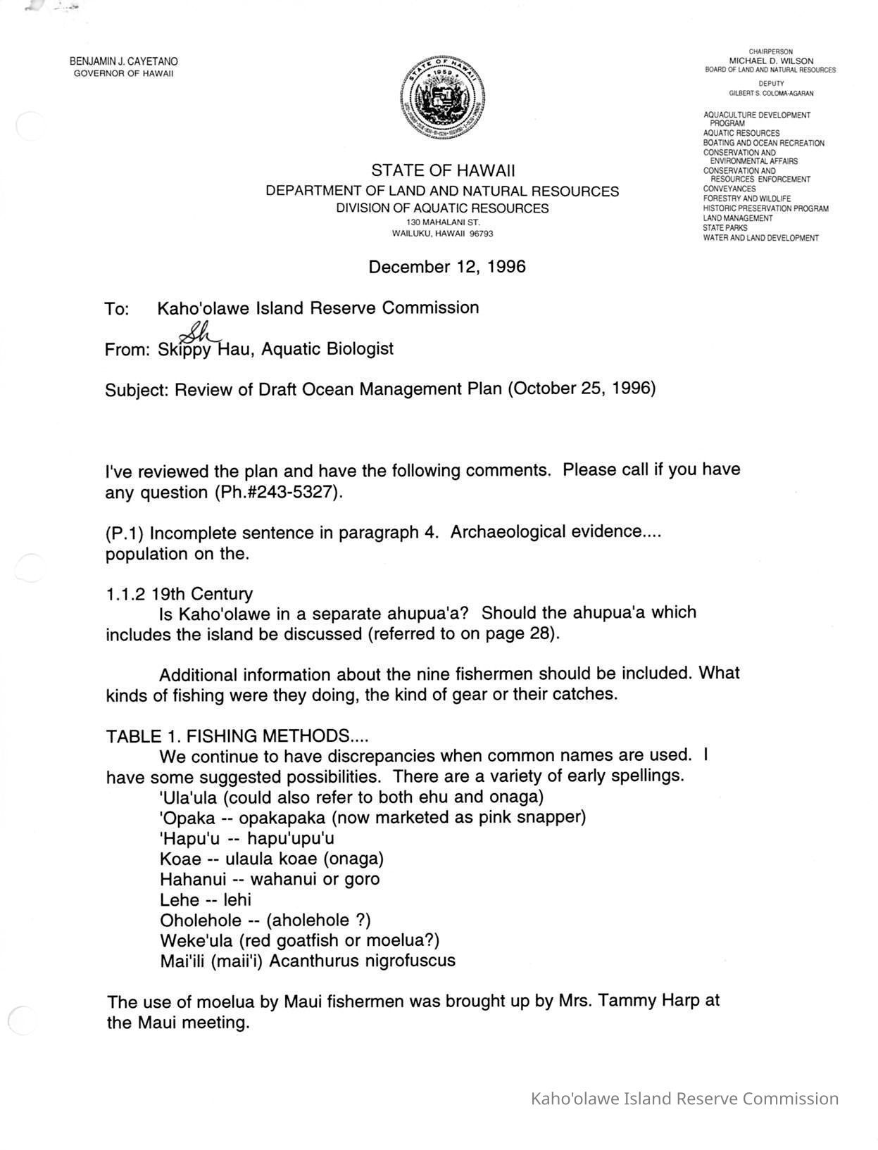 Original written comments of Skippy Hau, Aquatic Biologist, Division of Aquatic Resources, Department of Land and Natural Resources State of Hawaii regarding Draft Ocean Management Plan (October 25, 1996). Four pages computer printed letter sized pages.Creator