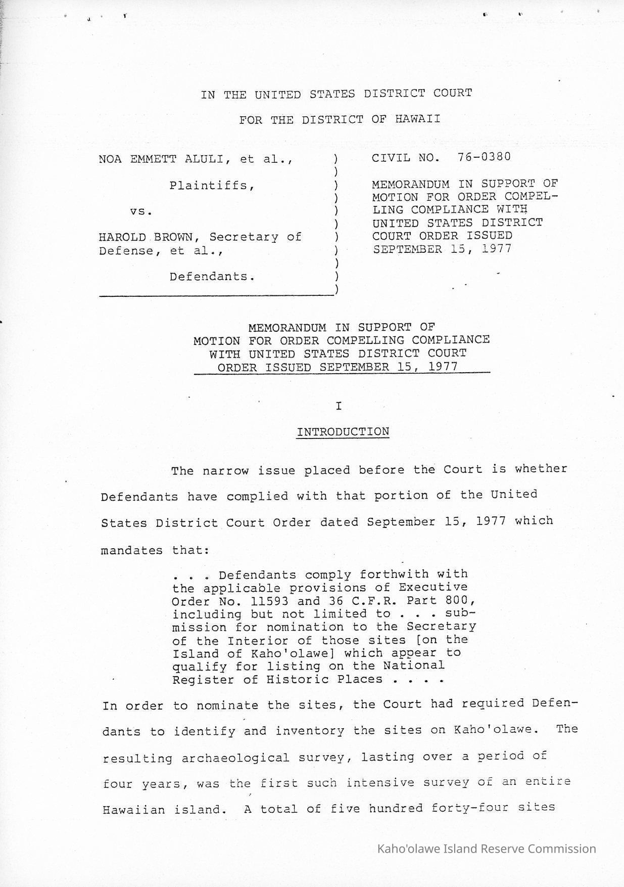 Copy of Memorandum in Support of Motion for Order Compelling Compliance with United States District Court Order Issued September 15, 1977. 23 xerographically black and white copied 8.5" x 14" pagesCreator
