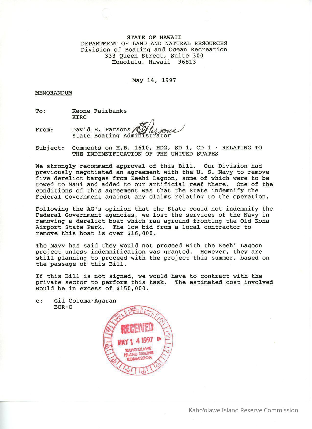 Memo to Keone (sic) Fairbanks, KIRC from David E. Parsons, State Boating Administrator re: Comments on H.B. 1610, HD2, SD 1, CD 1-Relating to the Indemnification of the United States. Excerpt: "We strongly recommend approval of this Bill." Memo received by the KIRC on May 14, 1997.Collection