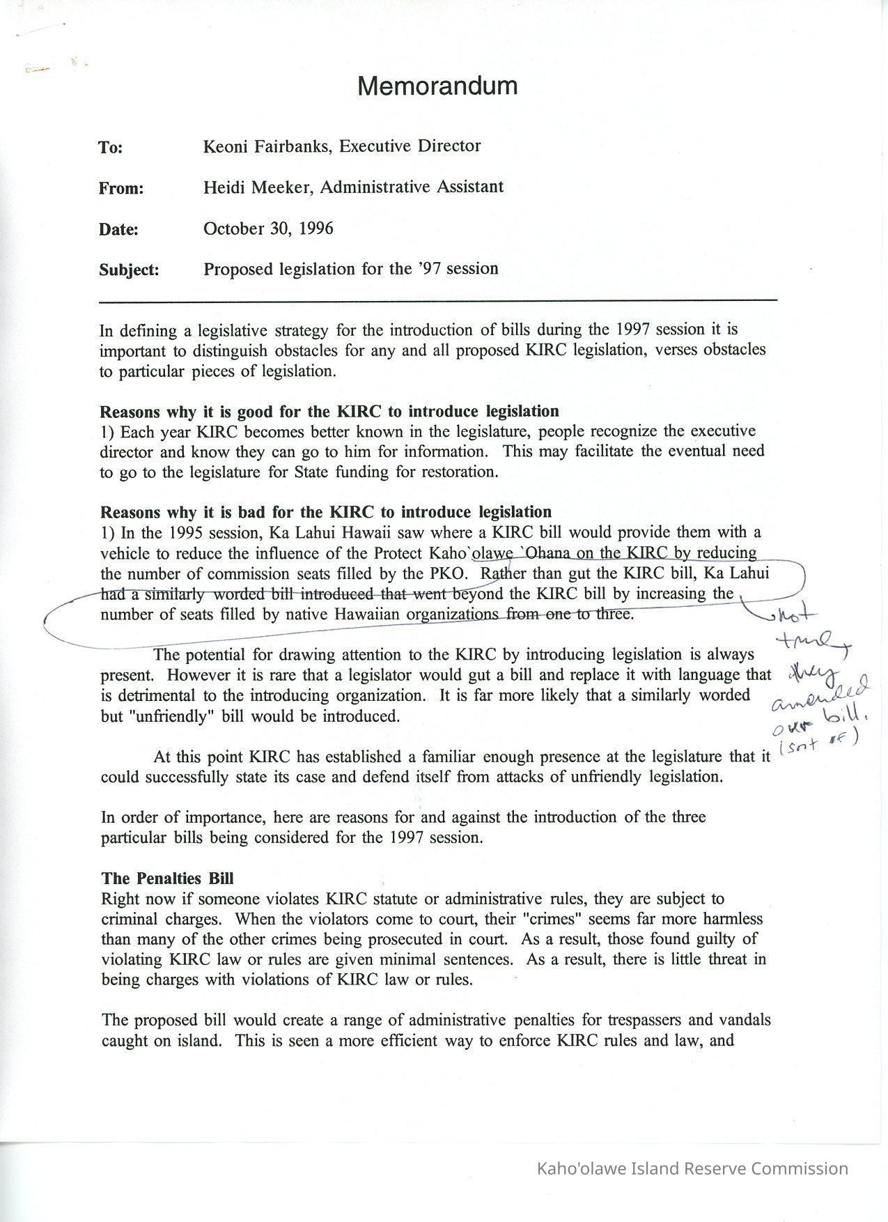 Memorandum to Keoni Fairbanks, Executive Director from Heidi Meeker, Administrative Assistant re: Proposed legislation for the '97 session. Contents: Reasons why it is good for the KIRC to introduce legislation, Reasons why it is bad for the KIRC to introduce legislation, the Penalities bill, the DoCARE bill, the Housekeeping Bill. There are hand written notes on the first page. There is also a blue post-it note on the back of the first page with hand written notes (presumably by Keoni Fairbanks).Collection