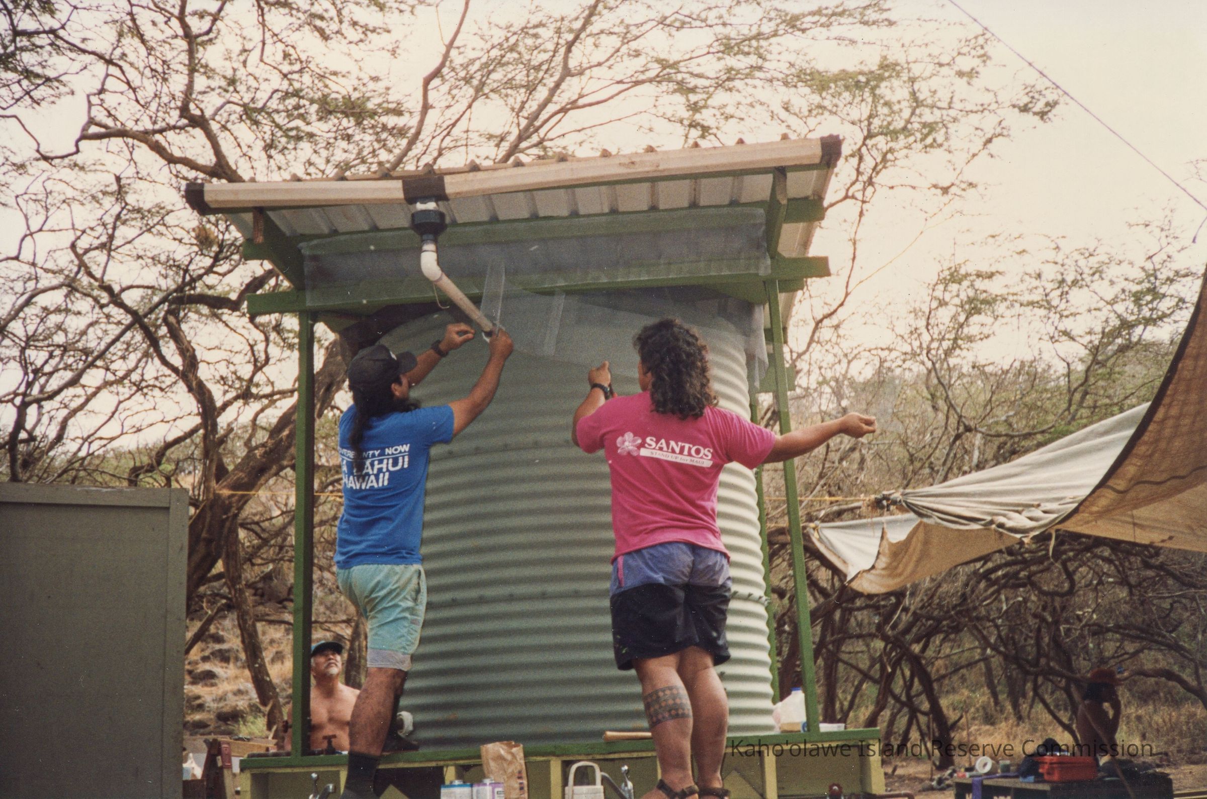 Color photo of two unidentified men affixing mesh material along one side of a water storage structure next to a tarp-covered camping site. This photo was probably taken in Hakioawa.