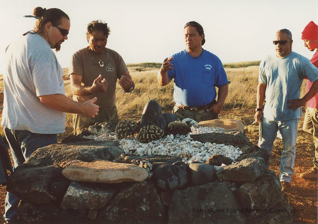 Color photo of several men consulting around rain ko'a (shrine) at catchment possibly at the top of Pu'u 'O Moaula Nui. The rain ko'a has coral branch and other types of coral on top.