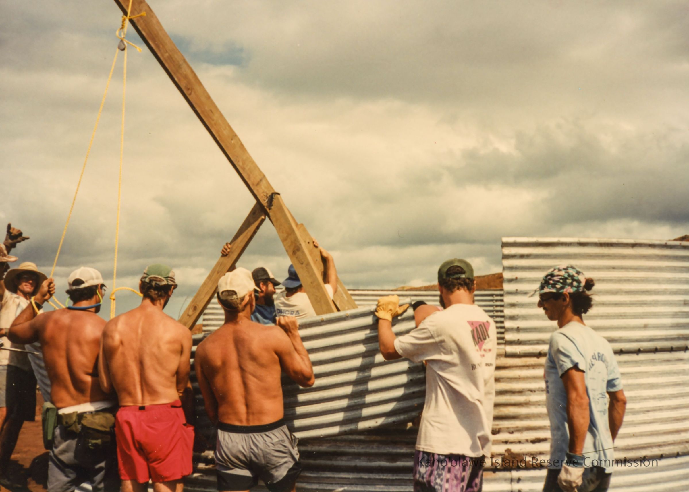 Color photo of a group of men constructing a metal water catchment structure. The photo was probably taken at Wailuna in Hakioawa 'Ili during the PKO (Protect Kaho'olawe 'Ohana) access to build a water catchment.
