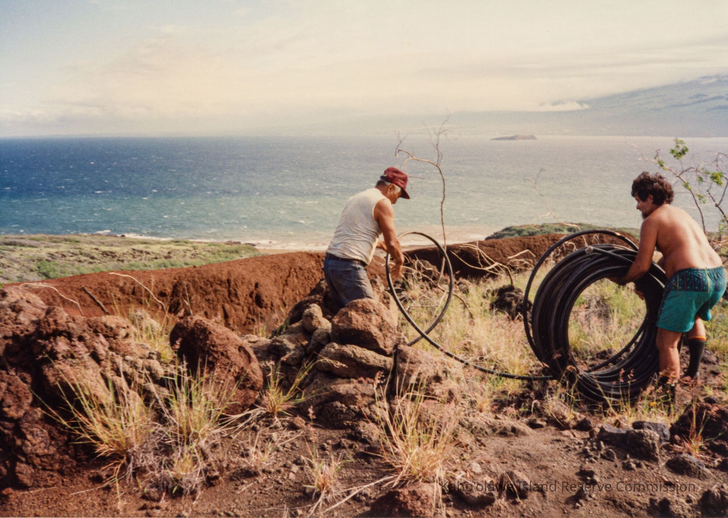 Two individuals are working together to install an irrigation line on a rocky hillside overlooking a scenic ocean view under a clear sky.