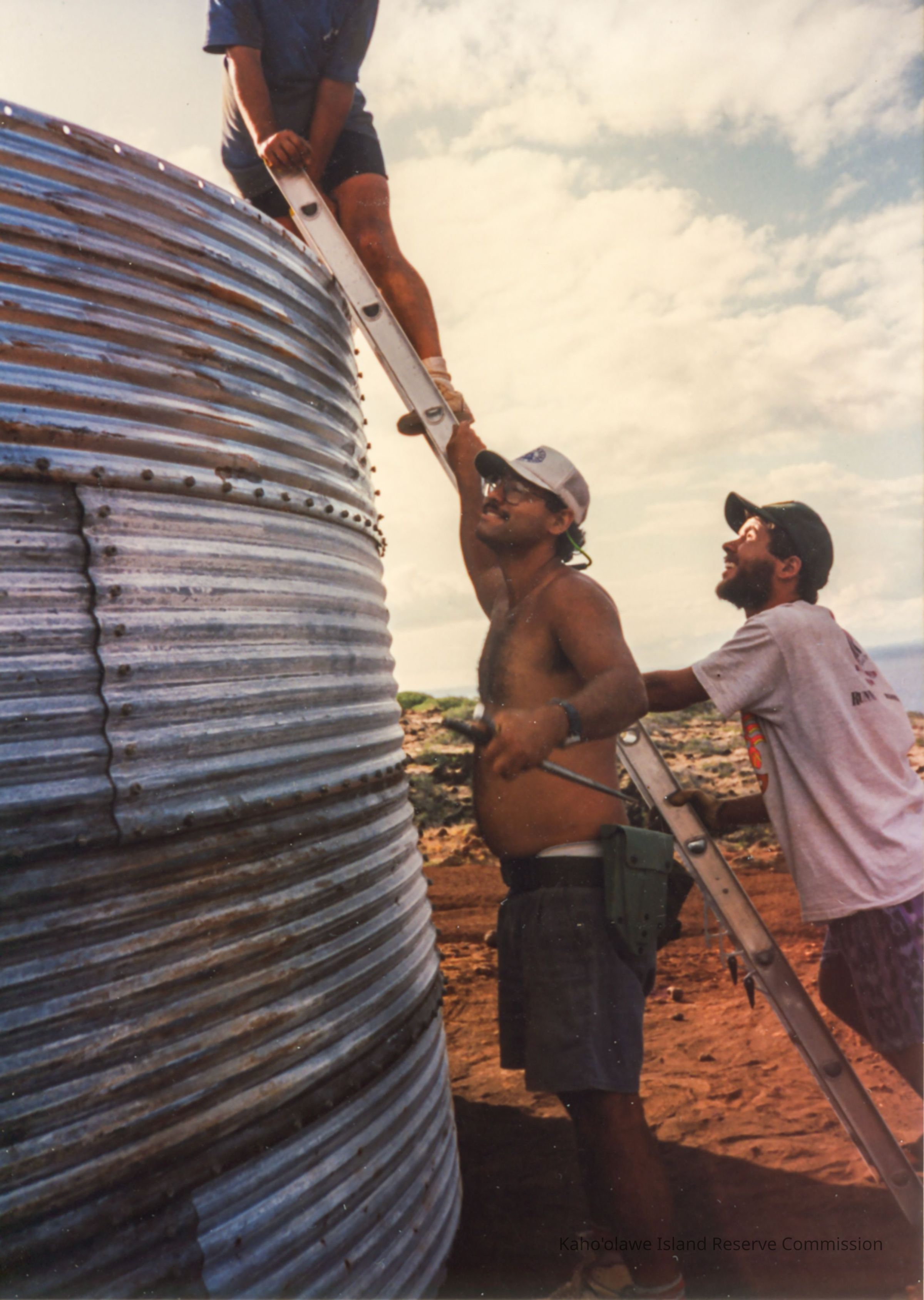 Color photo of two men on a ladder leaning against a metal water catchment structure. There is an unidentified man holding on to the ladder with one hand. This photo was probably taken during the PKO (Protect Kaho'olawe 'Ohana) access to build a water catchment in Wailuna.