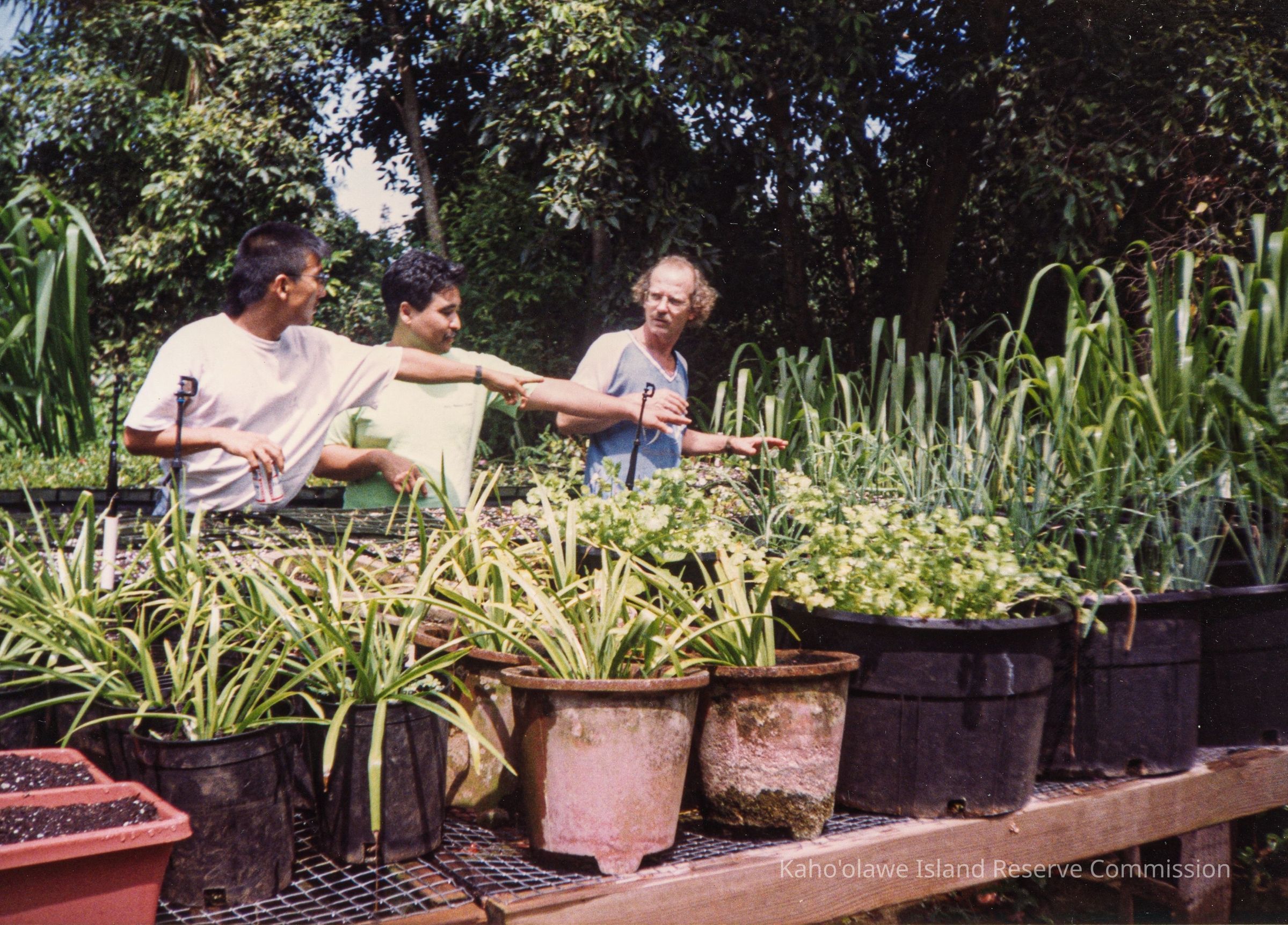 Color photograph of three unidentified men pointing to planters on top of tables. These plants were later taken to Kaho'olawe for planting.