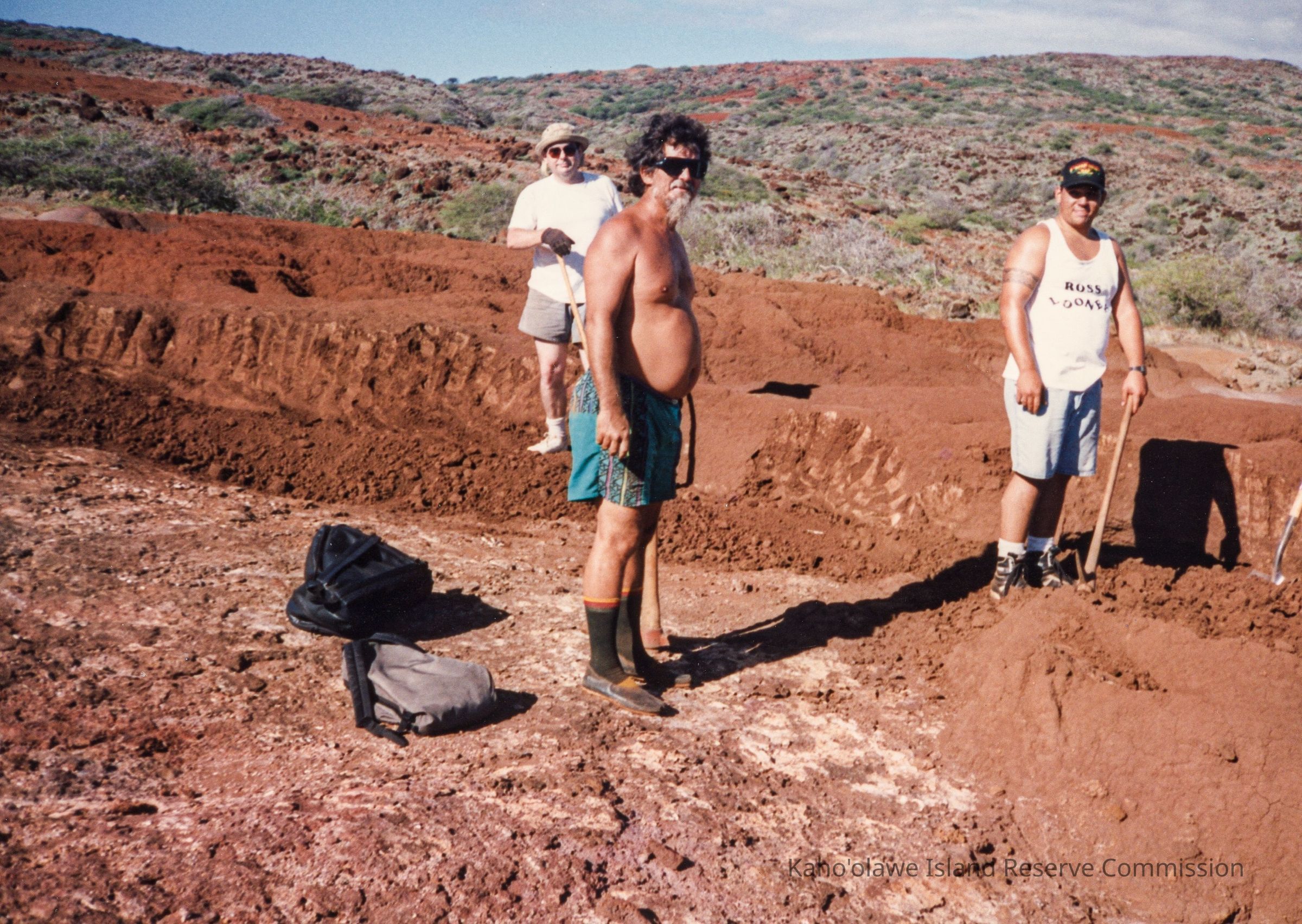 Color photograph of three unidentified men standing and posing near a trench dug in hardpan terrain.