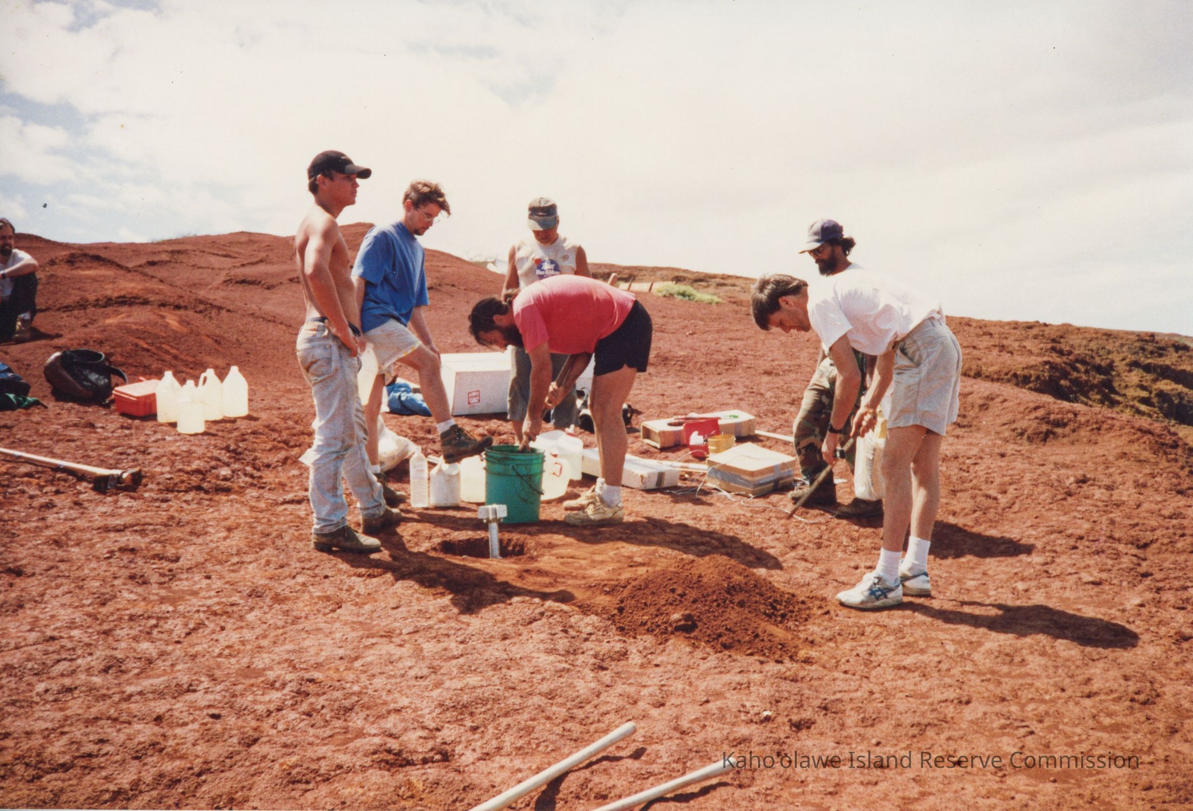 Color photograph of a group of unidentified kāne (men) (possibly Tom Giambelluca's team) working on hardpan terrain. One is digging with a pick axe. Another working on something in a five gallon bucket while others are watching.