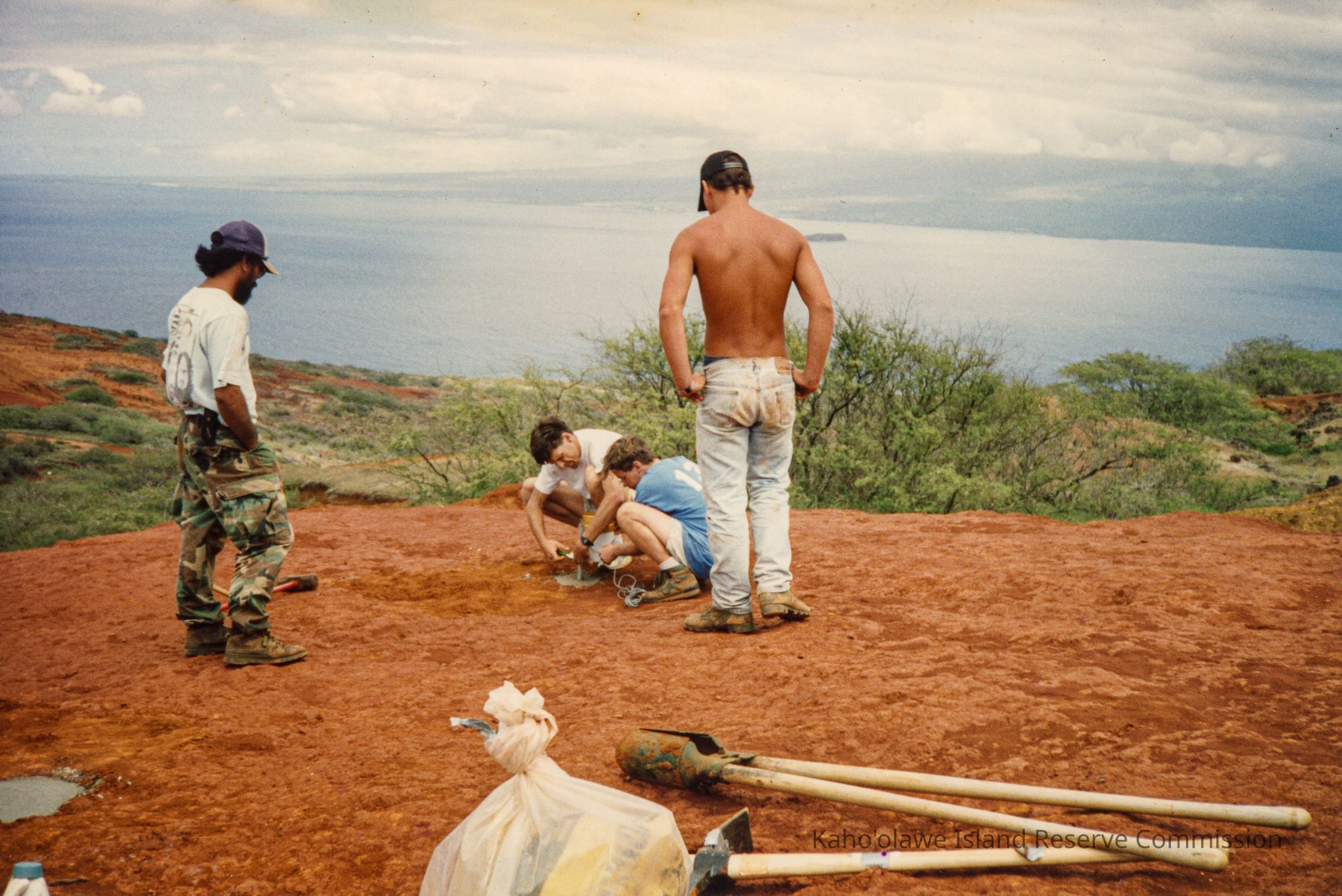 Color photograph of four unidentified kāne (men) working on hardpan terrain. Two kāne are installing a base for unknown equipment. There is a pot hole digger, a pick and a plastic bag in the foreground. Molokini and Maui are in the far background. The kāne may have been part of Tom Giabelluca's team.Photograph Details