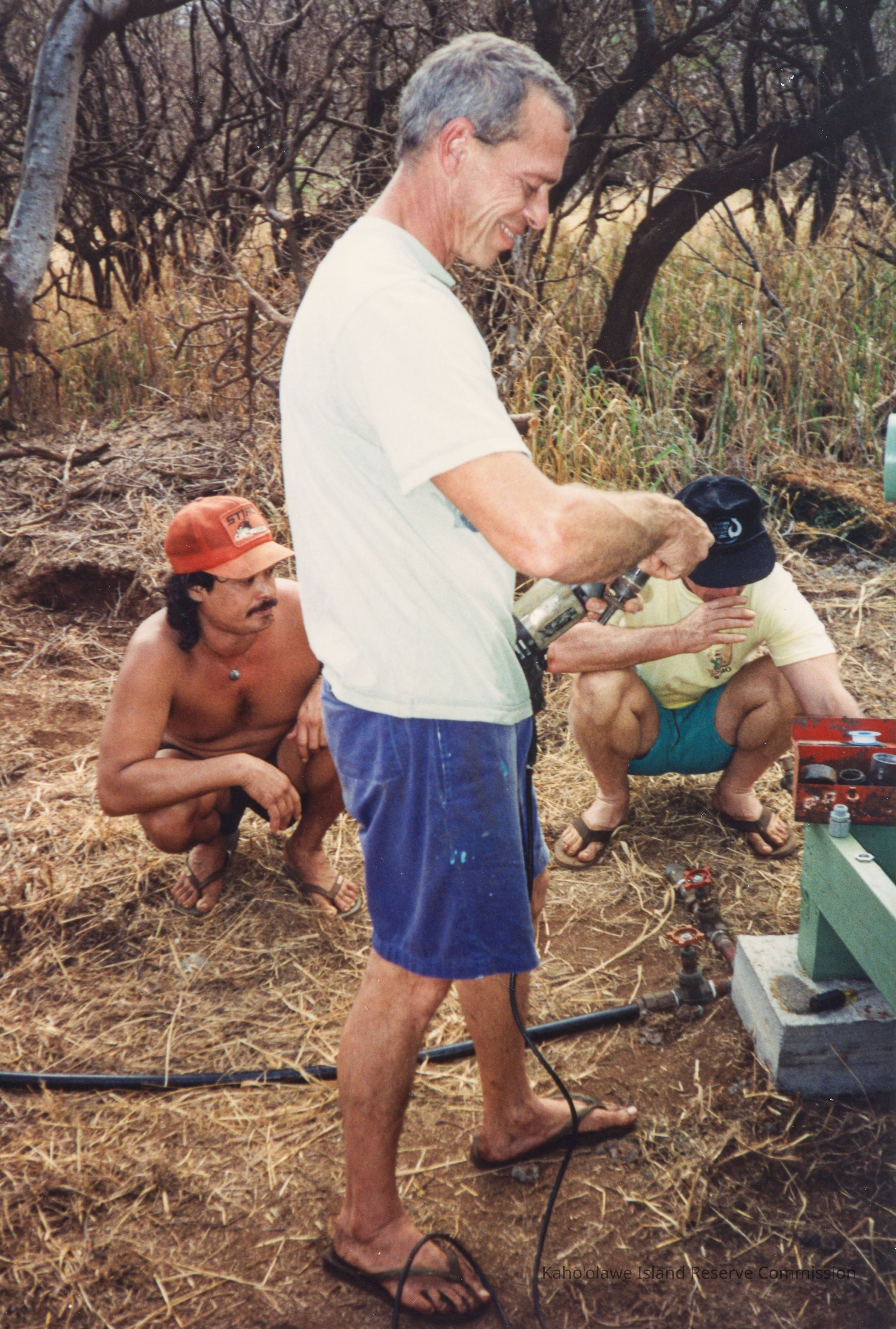 A man wearing a white shirt and blue shorts uses a drill, while two others squat nearby, in a dry, grassy outdoor setting
