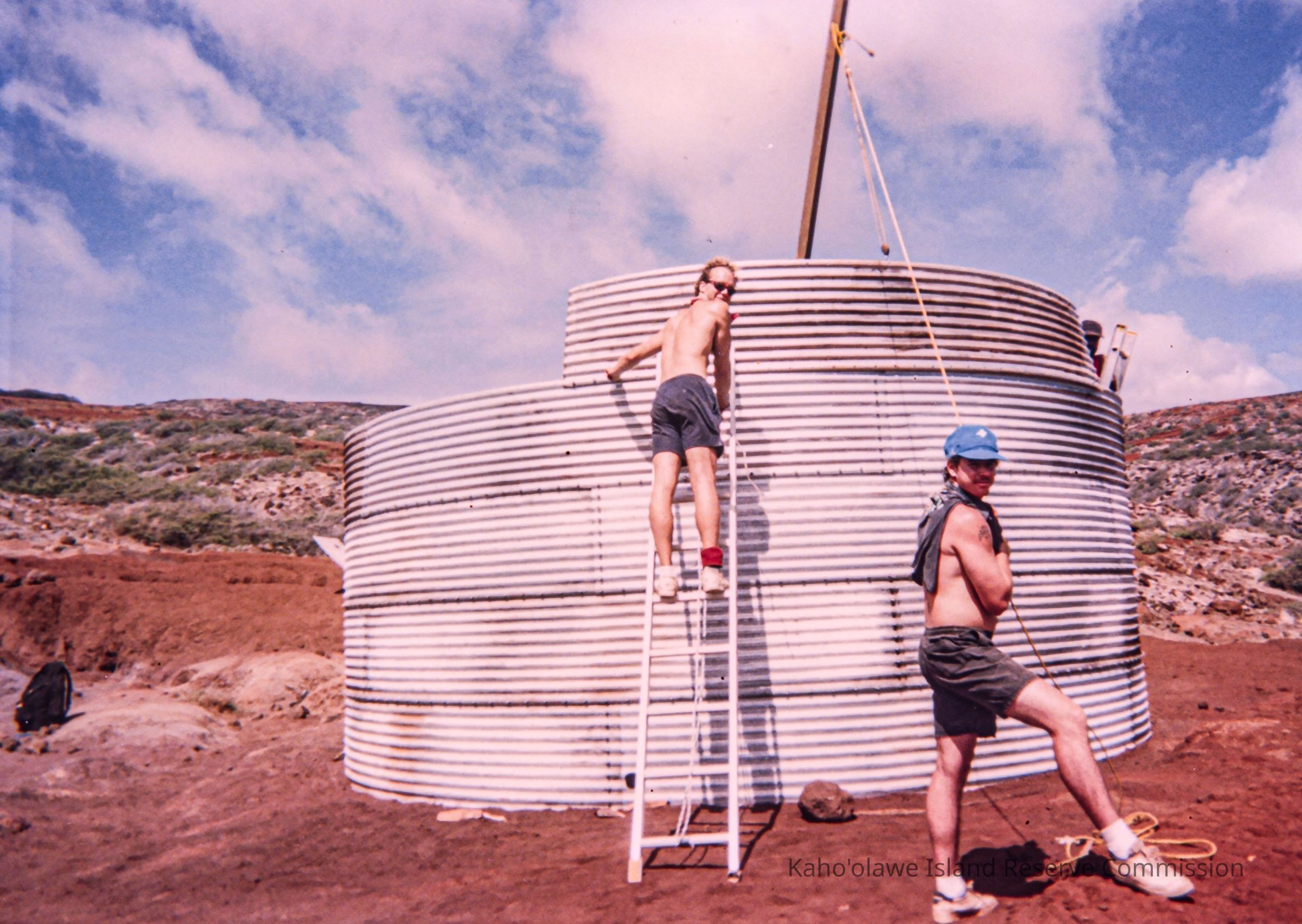 Color photo of three men working on a water catchment structure. Two men are standing on separate ladders--one is in the front and the other is behind the structure. Another is holding a wooden plank using a rope. The structure stands on hardpan terrain. This photo was probably taken at Wailuna in Hakioawa 'Ili during a PKO (Protect Kaho'olawe 'Ohana) access to build a water catchment.