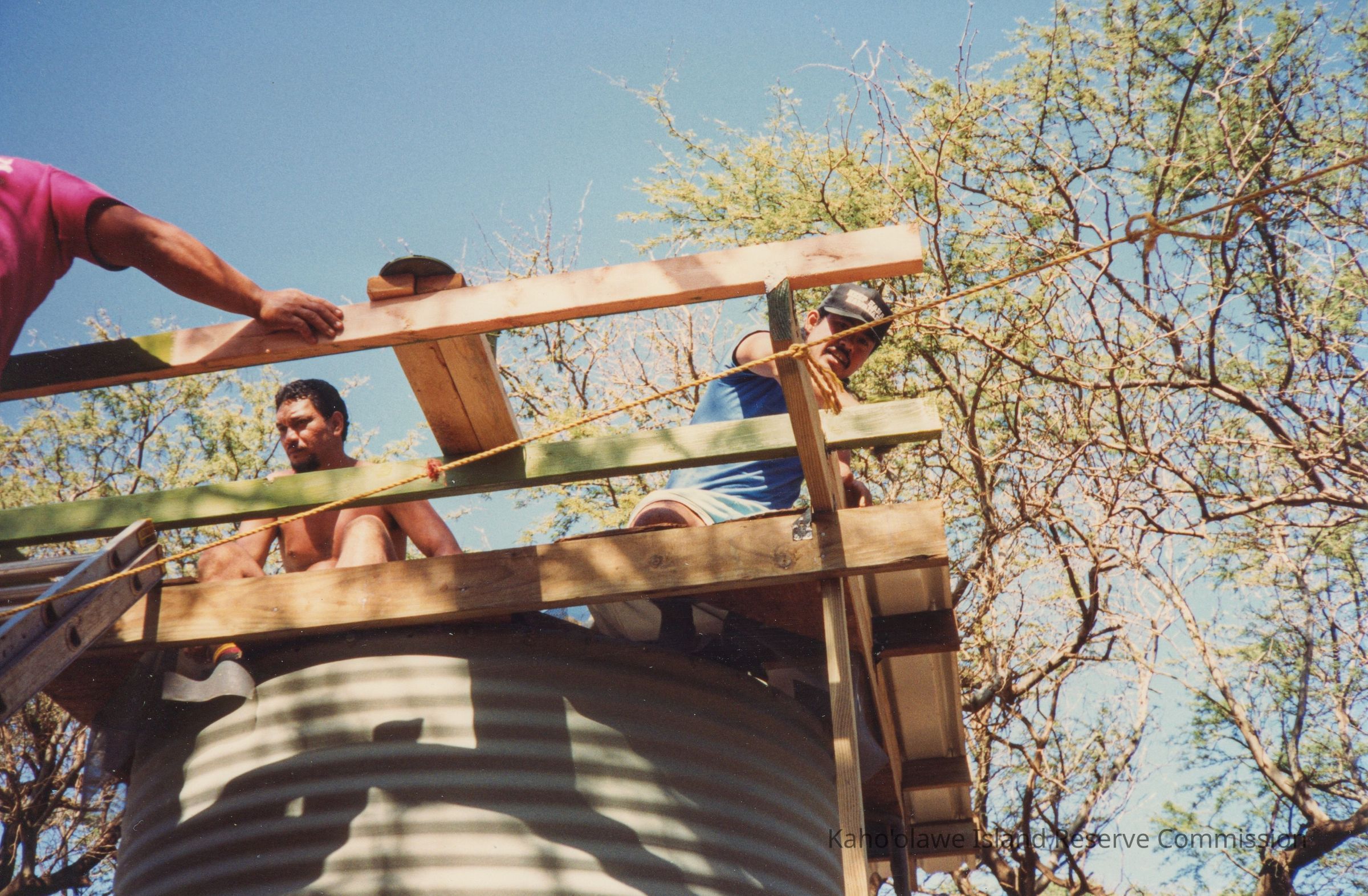Two individuals are constructing a water storage structure, working on a wooden platform atop a cylindrical tank under a clear blue sky.