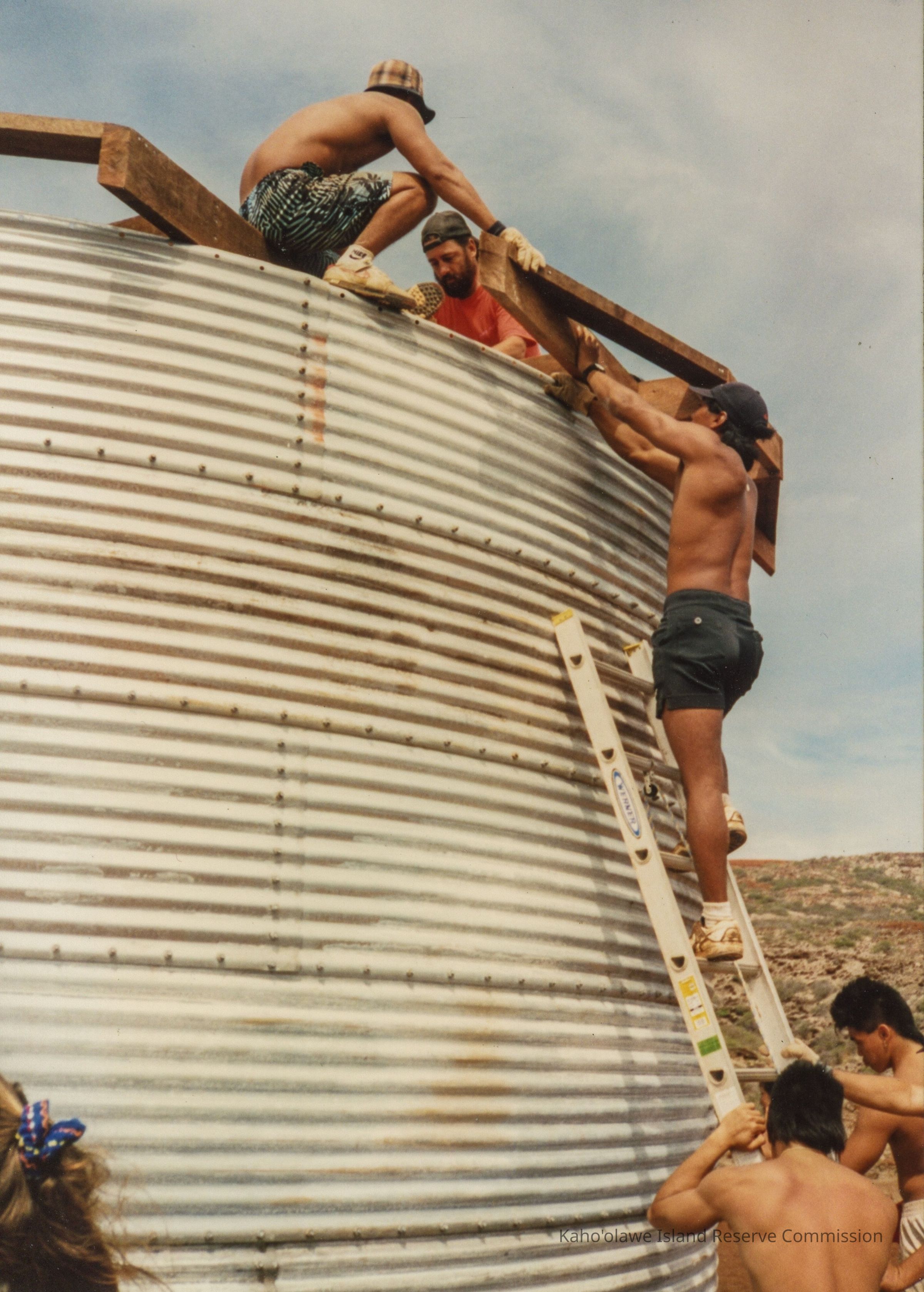 Color photo of a group of mostly unidentified men (Dan Holmes in red shirt) working on a circular, corrugated metal water catchment structure. Two men are holding and working on a wooden frame at the top of the structure while a man is holding the frame while standing on a metal ladder leaning against the structure. Two men are supporting the ladder. This photo may have been taken at Wailuna in Hakioawa 'Ili.Photograph Details