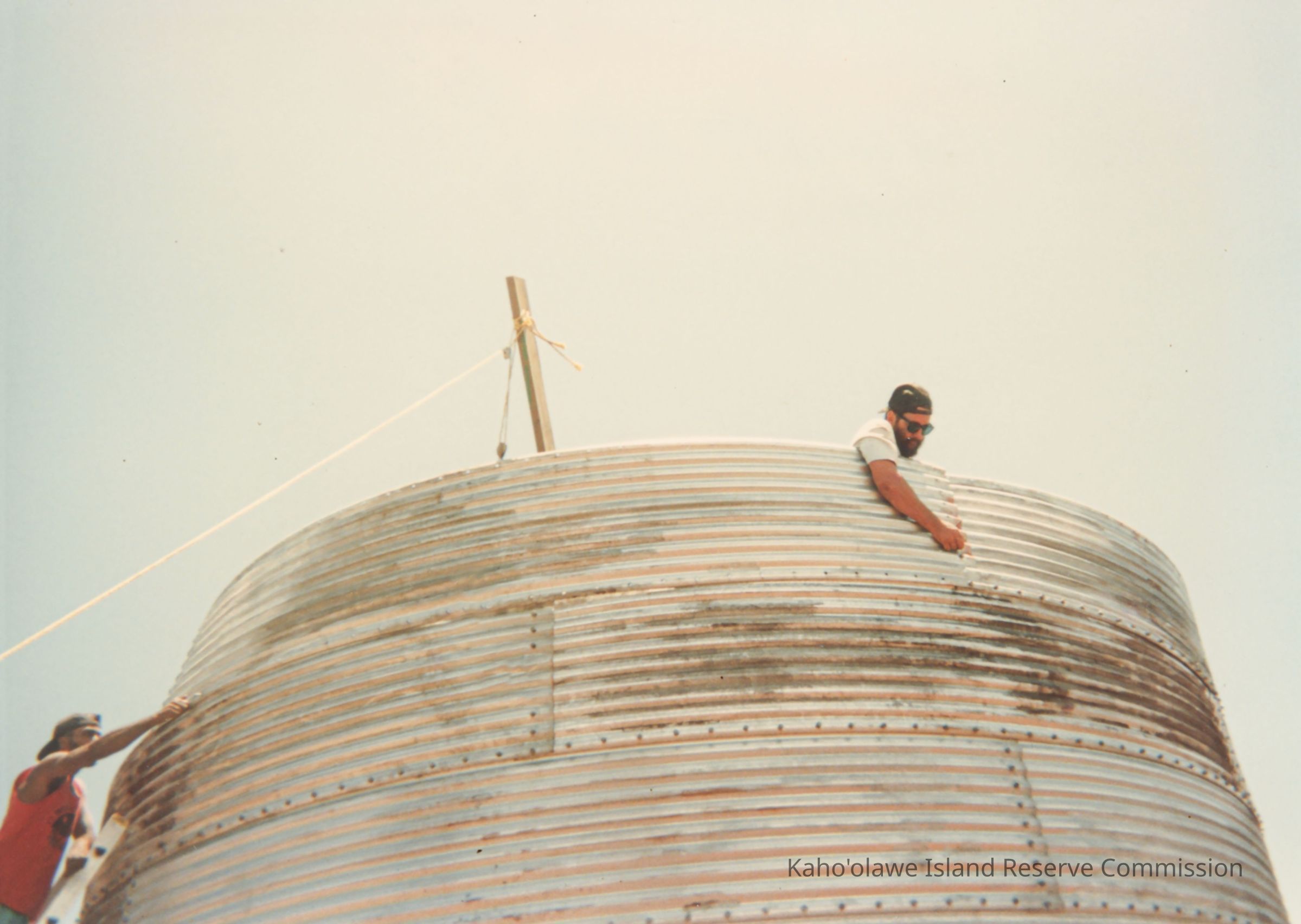 Color photo of two unidentified men working on a corrugated metal water catchment structure. One man is using a ladder on the outside of the structure to working rivets. The other man is on the inside of the structure leaning over the top to work on outside rivets. This photo was probably taken during the 1993 PKO (Protect Kaho'olawe 'Ohana) access to build a water catchment at Wailuna in Hakiioawa 'Ili.