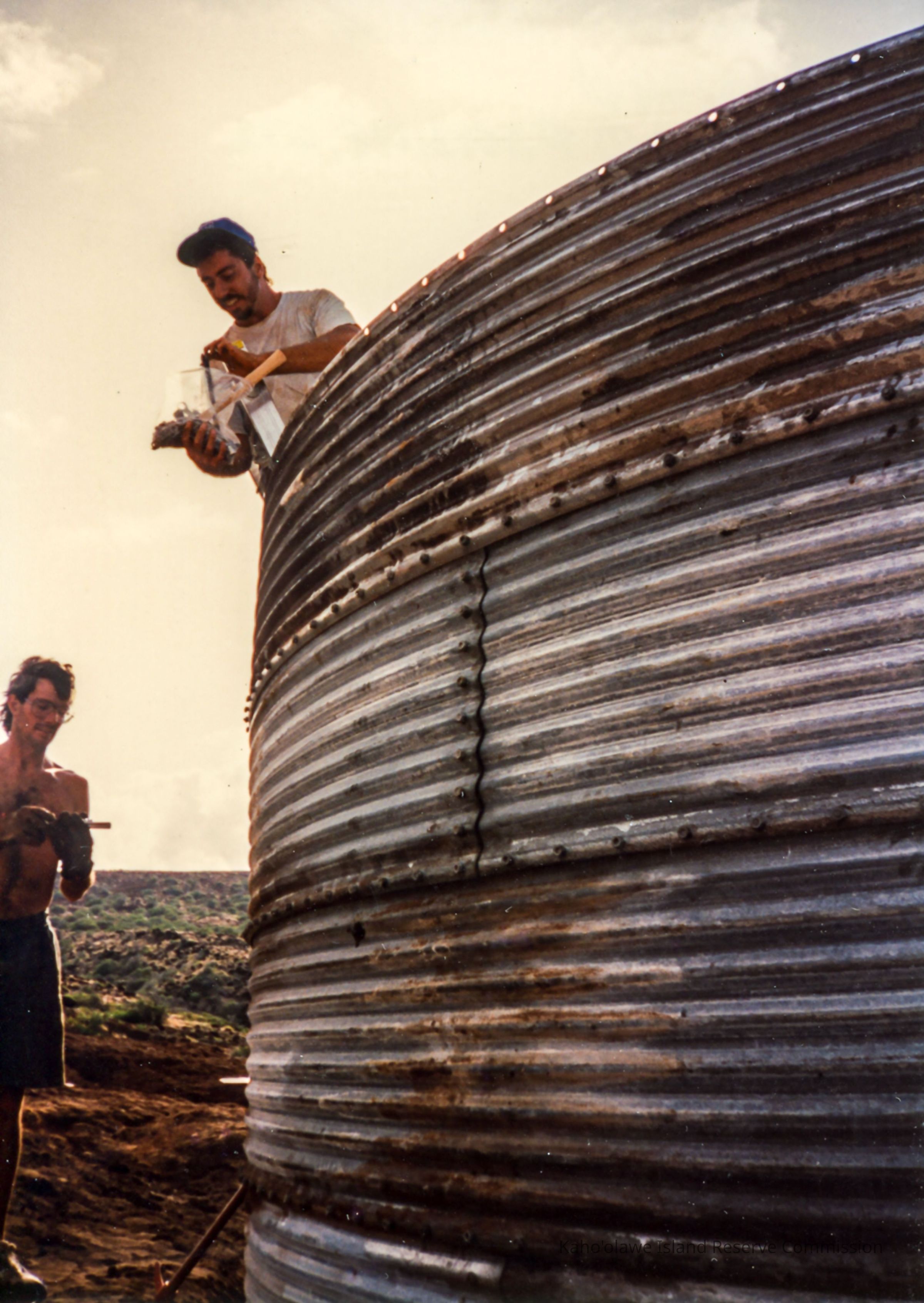 Color photo of two unidentified men working on a metal water catchment structure. One man is standing on the hardpan terrain and the other is standing on a ladder inside the structure. This phot was probably taken during the PKO (Protect Kaho'olawe 'Ohana) access to build a water catchment at Wailuna in Hakioawa 'Ili.