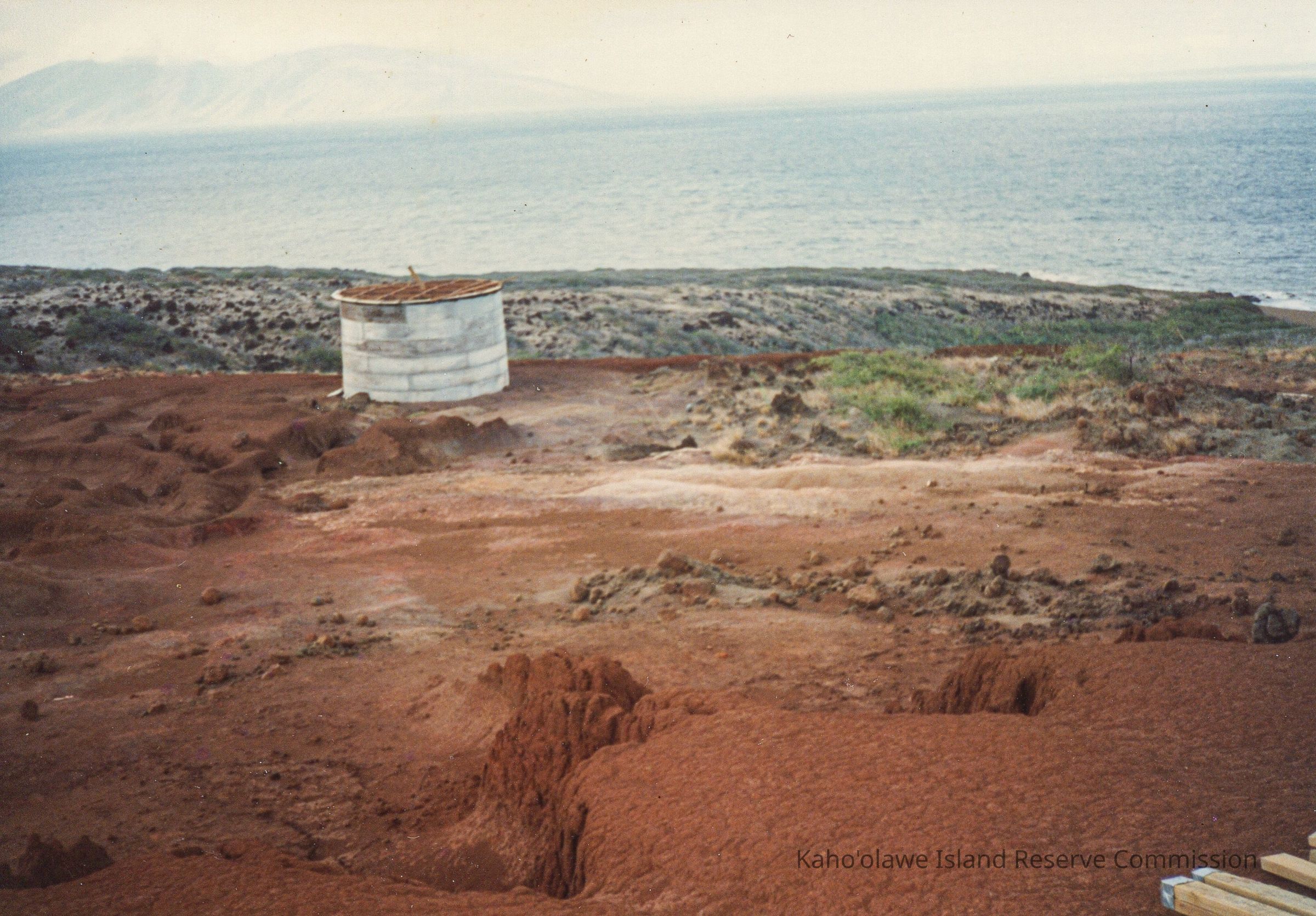 Color photo of a circular, corrugated metal water catchment structure from a far distance. The structure sits on hardpan terrain. The ocean and island of Maui are in the distance.