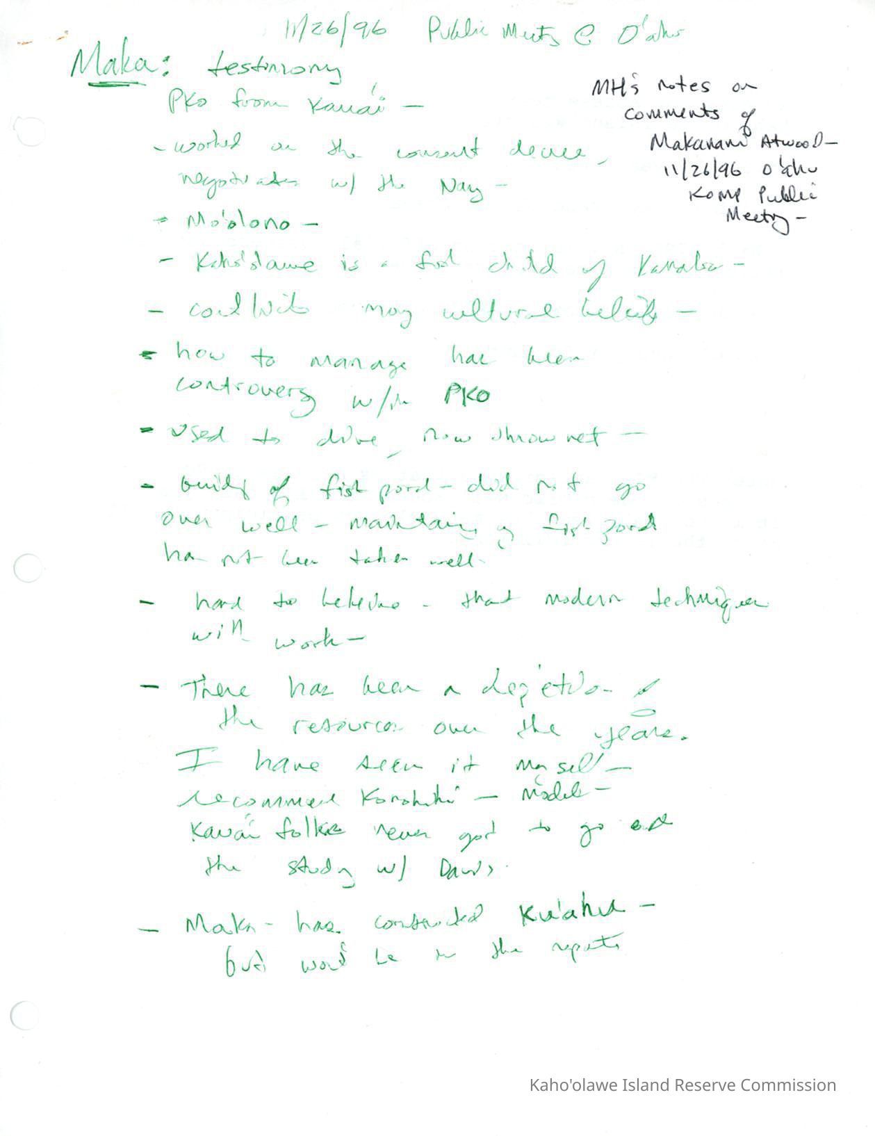 MH's notes on comments of Makanani Atwood at O'ahu 11/26/96 Draft KOMP public meetingDescription
