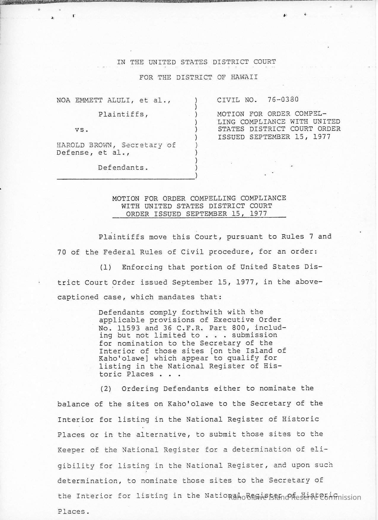 Copy of Motion for Order Compelling Compliance with United States District Order Issued September 17, 1977 for Civil No. 76-0380. Two xerographically black and white copied 8.5" x 14" pagesCreator