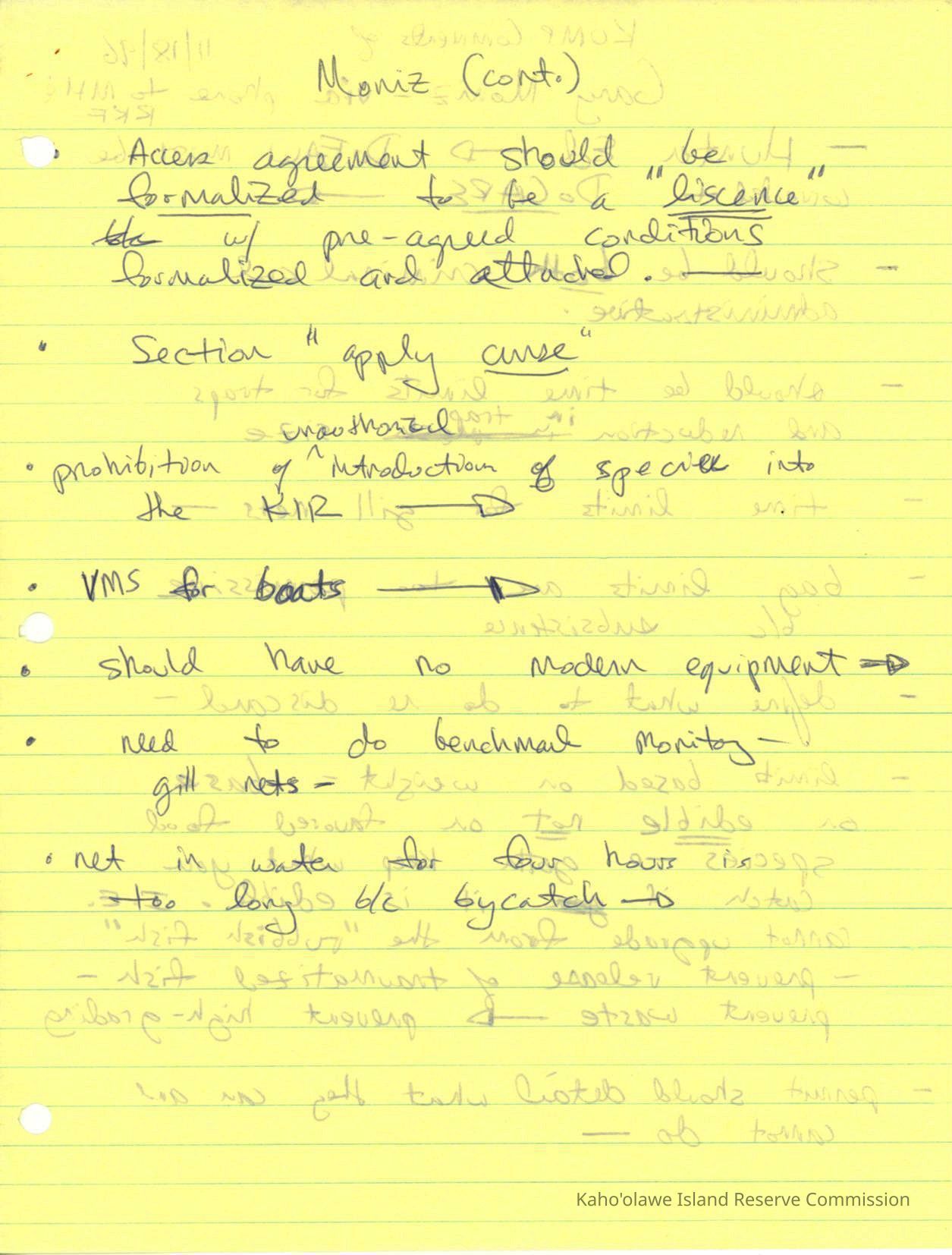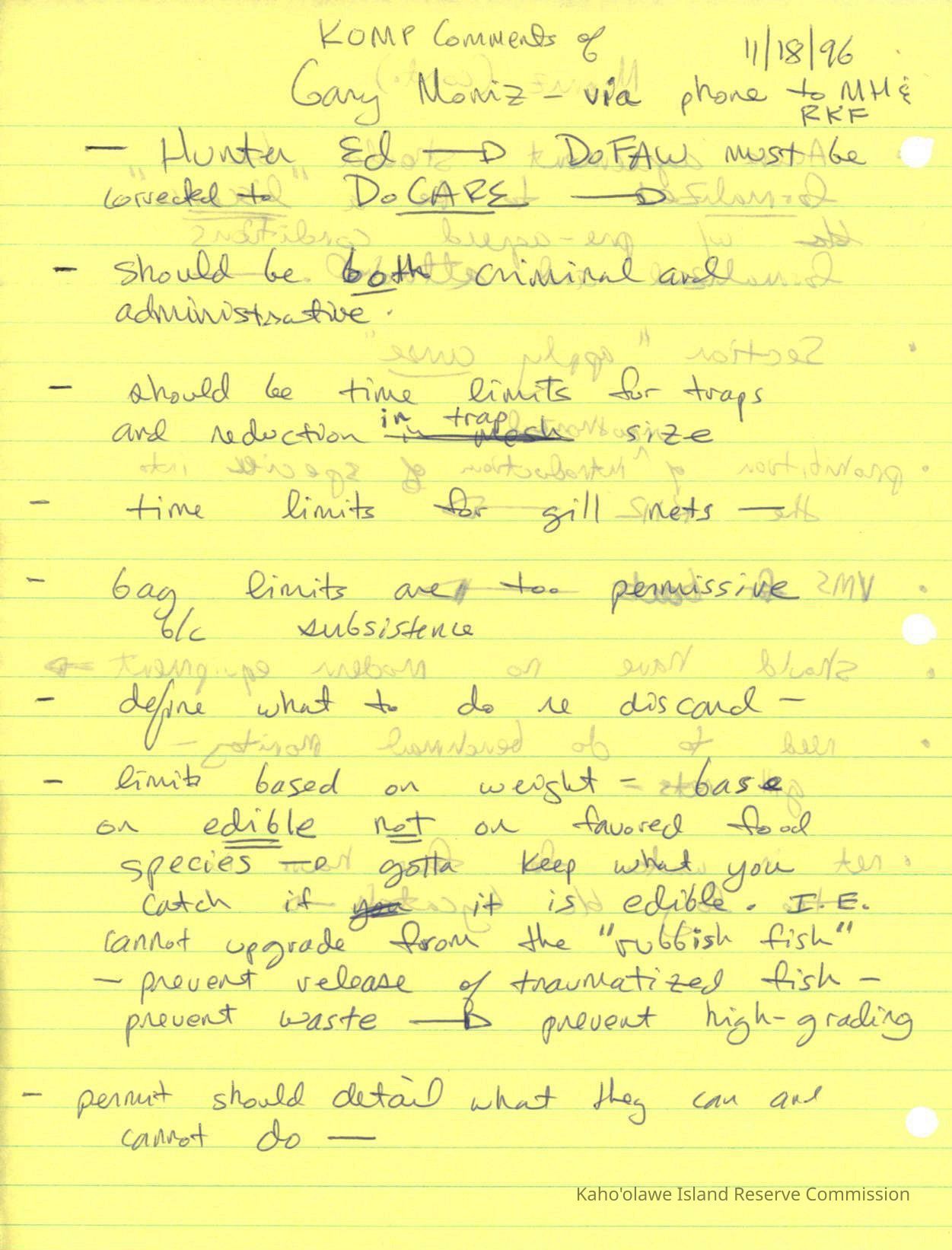 KOMP (Kahoolawe Ocean Management Plan) Comments of Gary Moniz via phone to MH (Marc Hodges?) & RKF (R. Keoni Fairbanks?) handwritten on yellow legal pad paper. 1 yellow lined paper pages (back to back).Date(s) of Creation