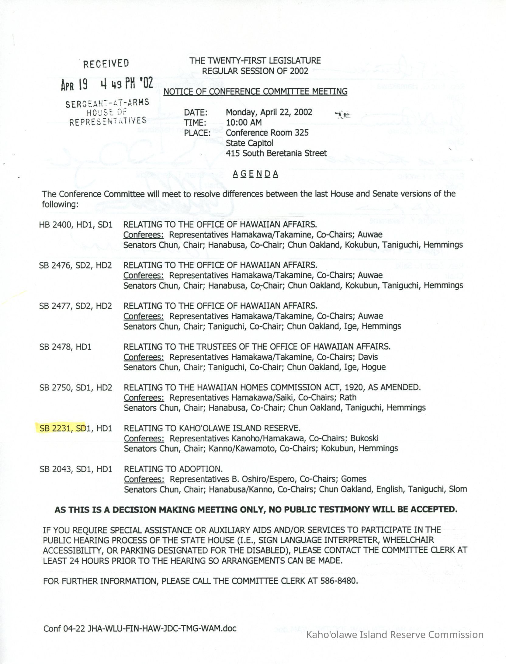 Notice of Conference Committee Meeting, April 22, 2002Description