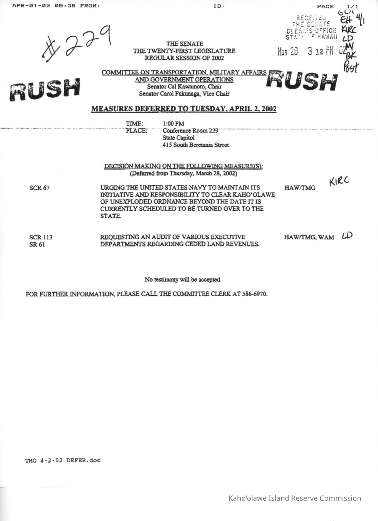 Faxed copy of The Senate, the Twenty-First Legislature, Regular Session of 2002, Committee on Transportation, Military Affairs and Government Operations, Measures Deferred to Tuesday, April 2, 2002, Decision Making on the Following Measure(s). One copied letter size page.Date(s) of Creation