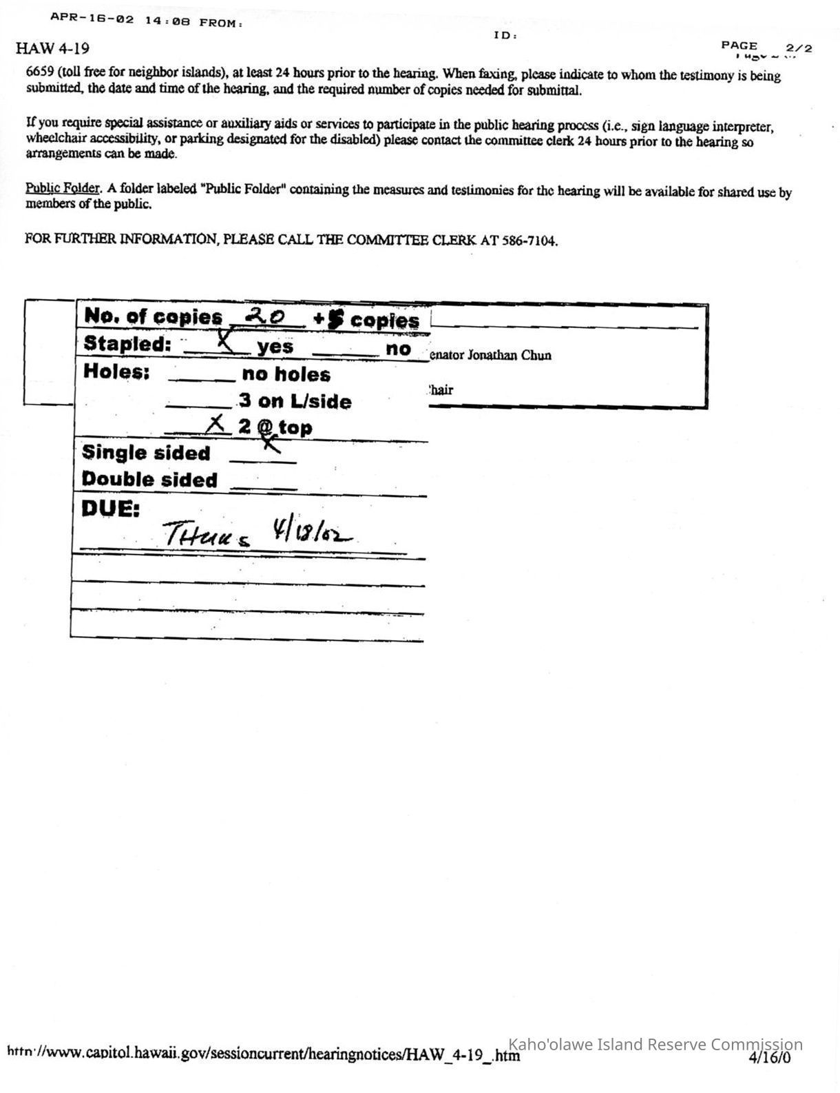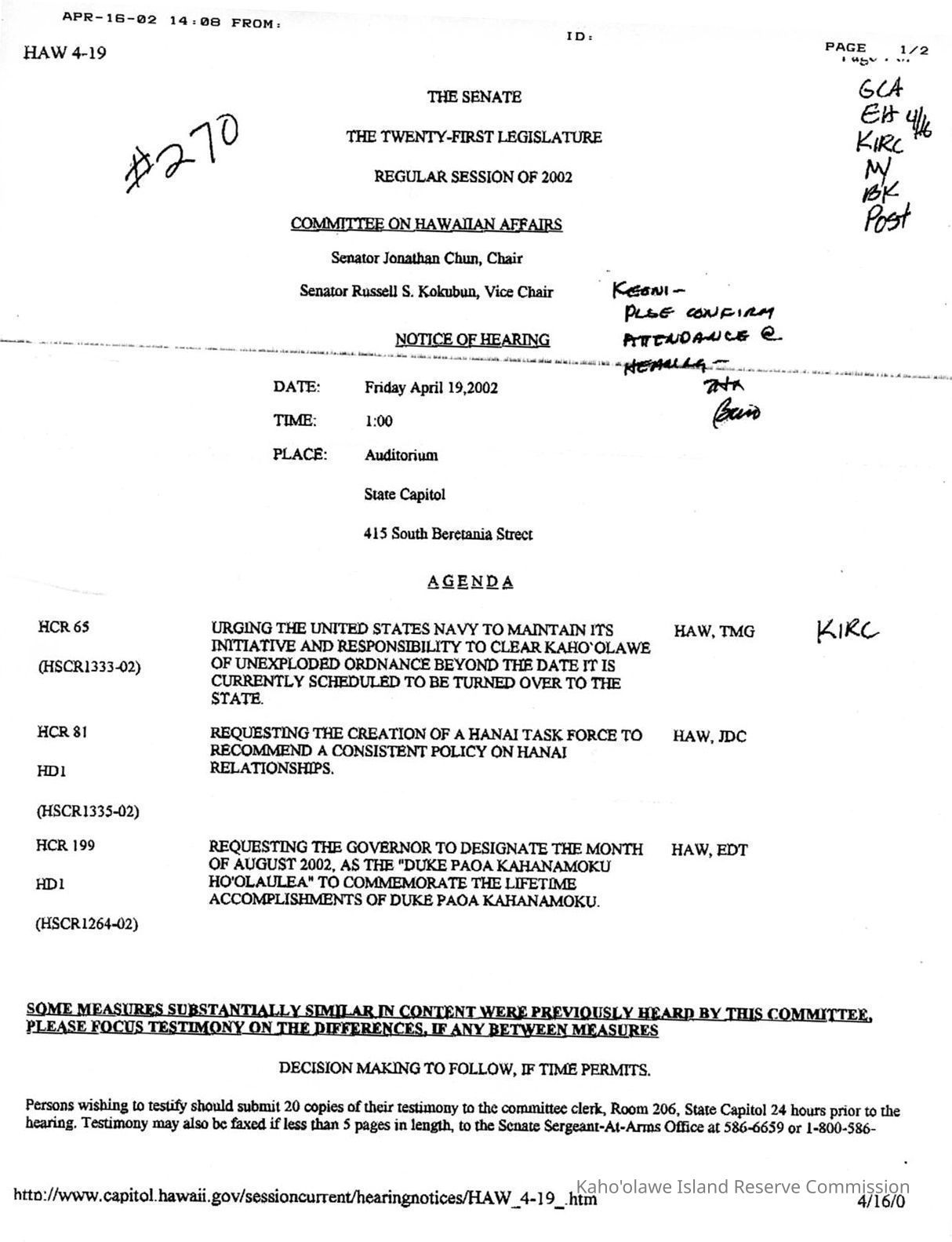 Faxed copy of The Senate, The Twenty-First Legislature, Regular Session of 2002, Committee on Hawaiian Affairs, Notice of Hearing, for Friday April 19, 2002.Creator