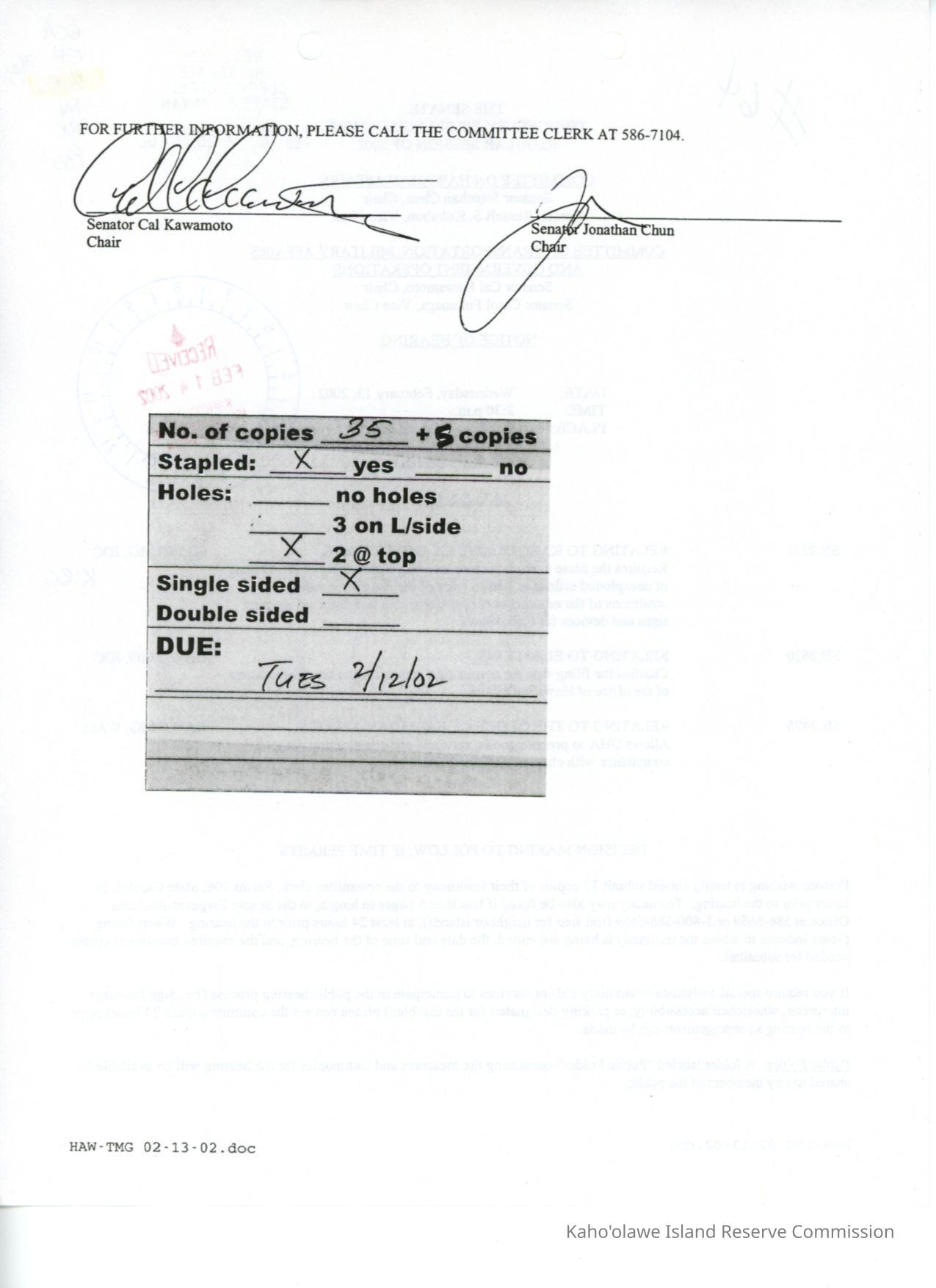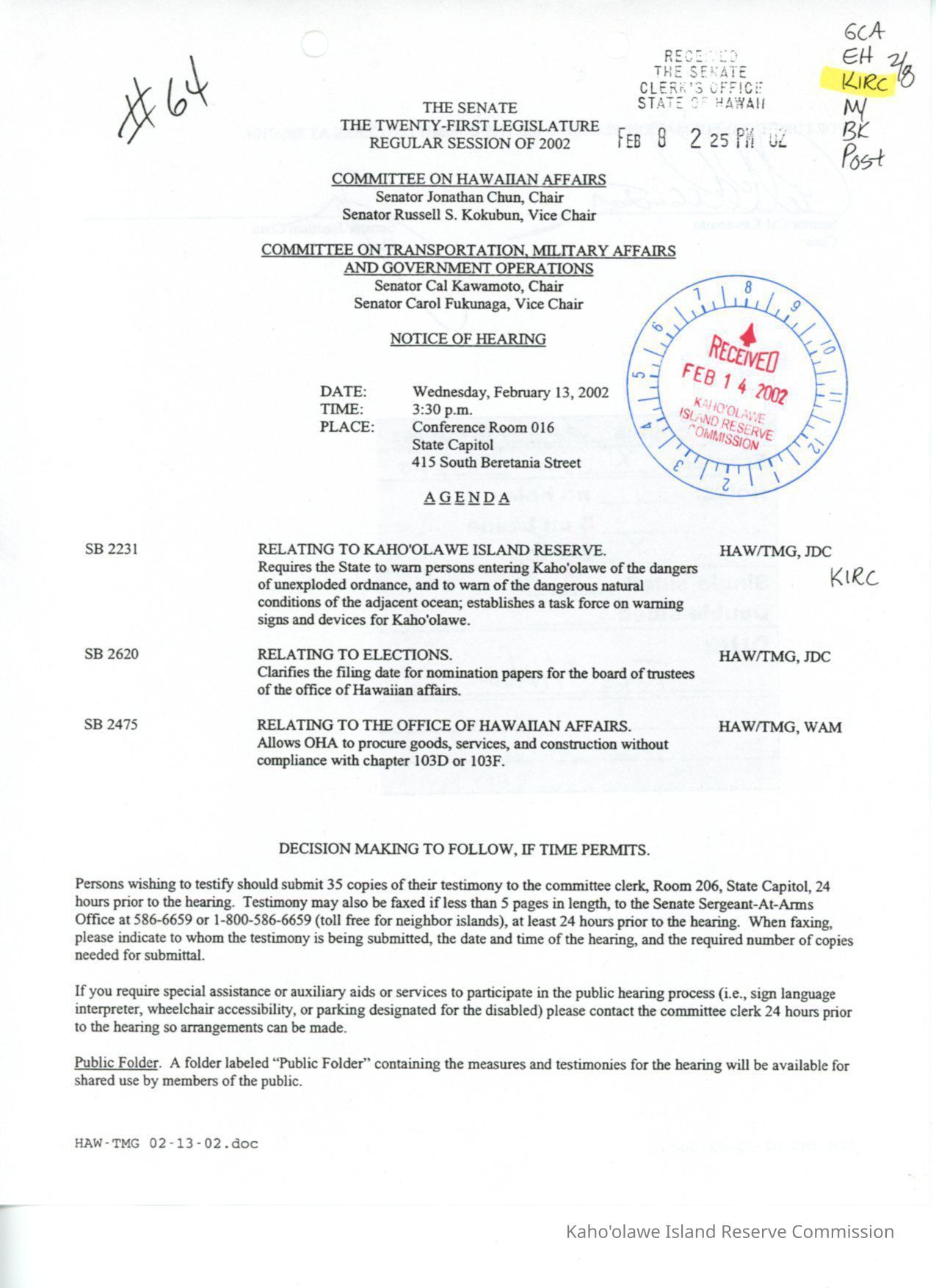 Copy of The Senate, The Twenty-First Legislature, Regular Session of 2002, Committee on Hawaiian Affairs, Committee on Transportation, Military Affairs and Government Operations, Notice of Hearing for Wednesday, February 13, 2002.Creator