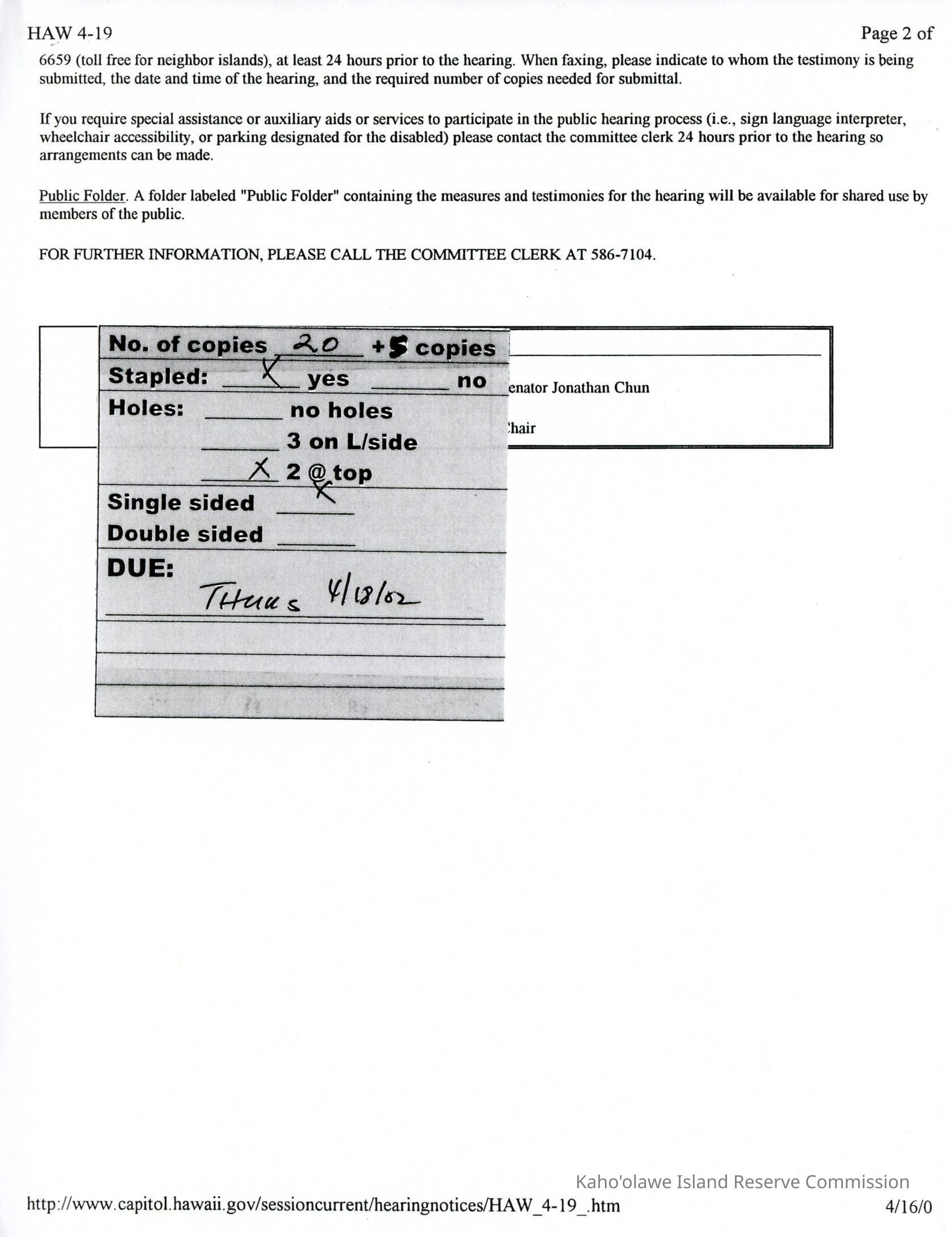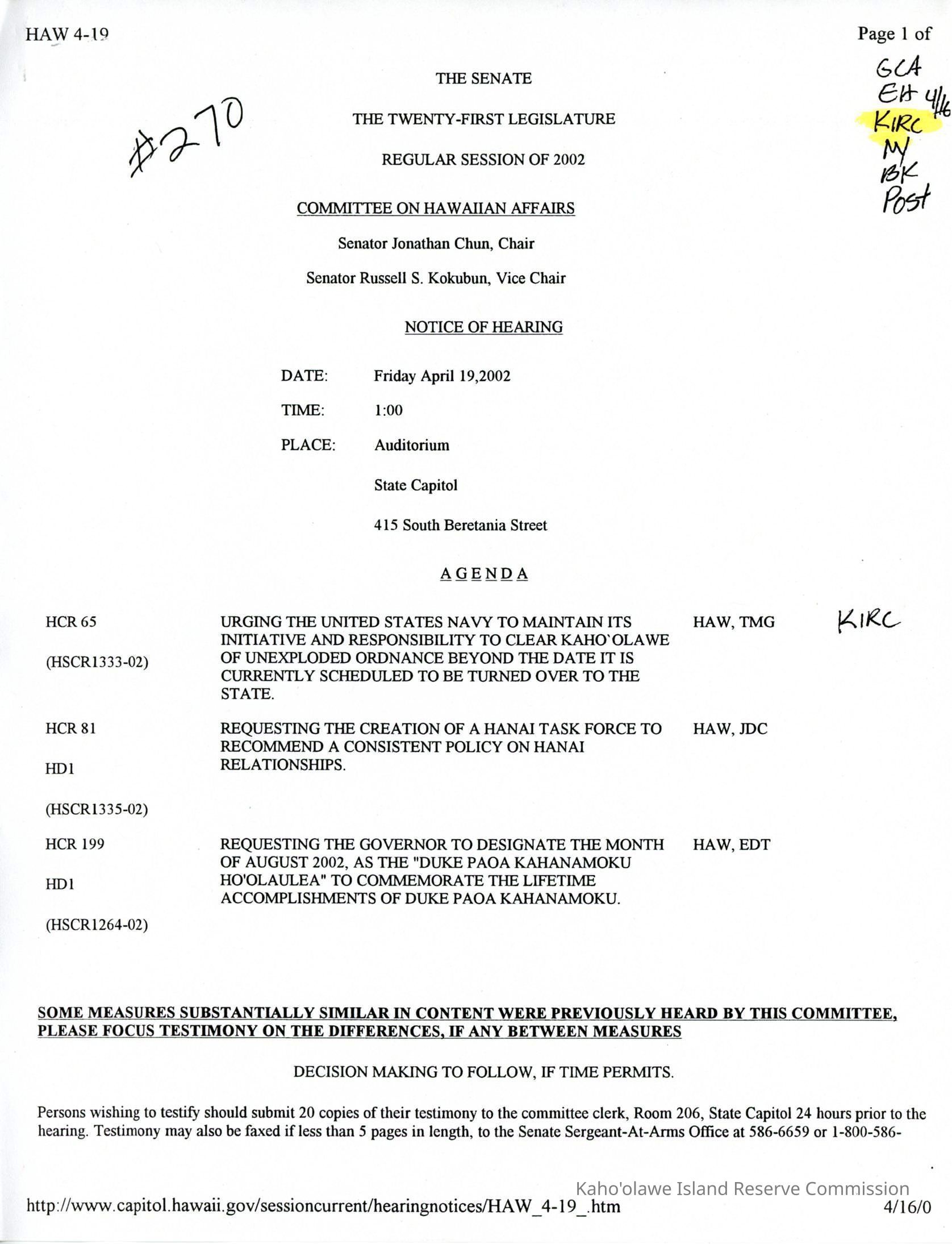 Hard copy of printout from Hawaii State Legislature website, www.capitol.hawaii.gov of The Senate, The Twenty-First Legislature, Regular Session of 2002, Committee on Hawaiian Affairs, Notice of Hearing for Friday April 19, 2002, downloaded on April 16, 2002. Two computer printed pages.