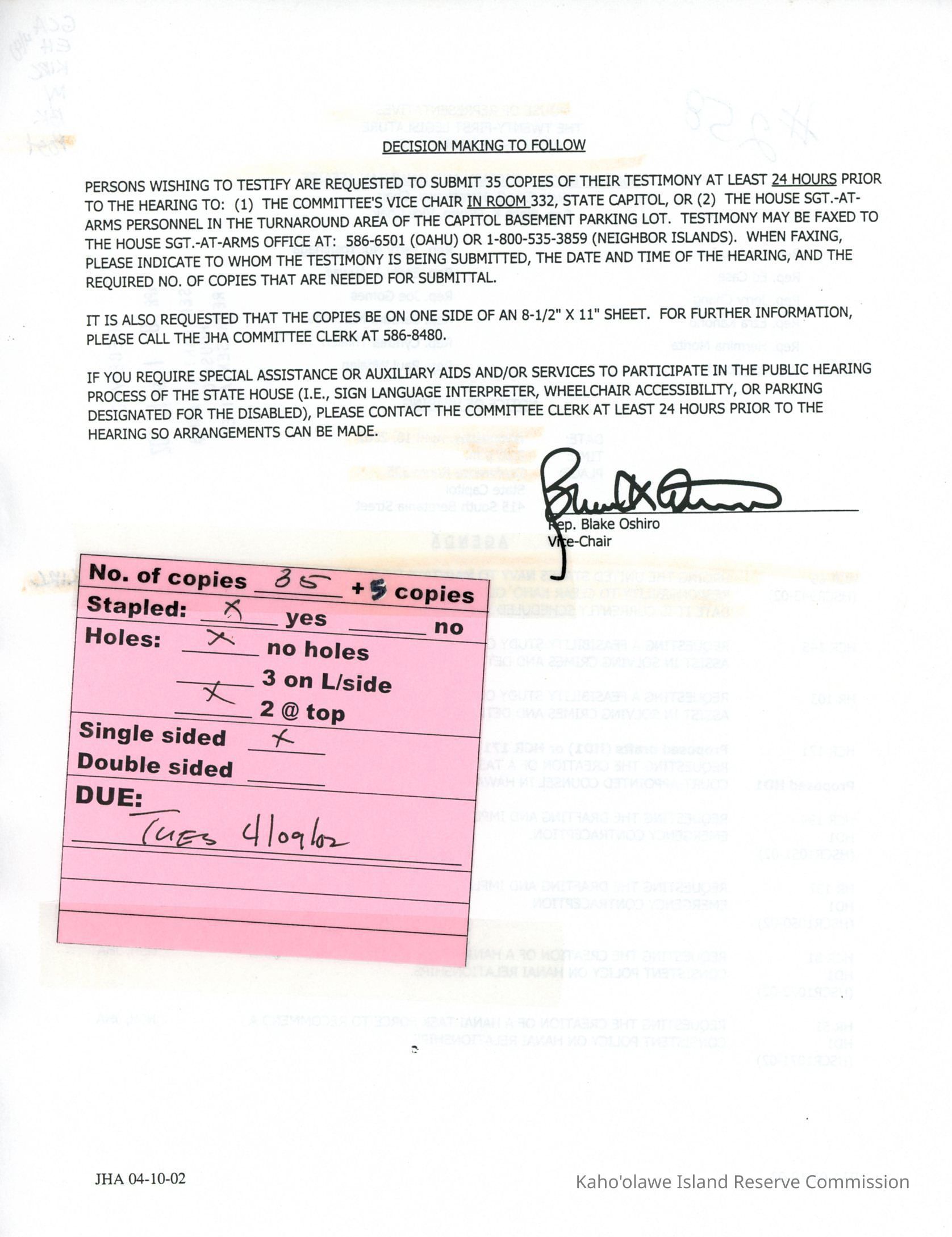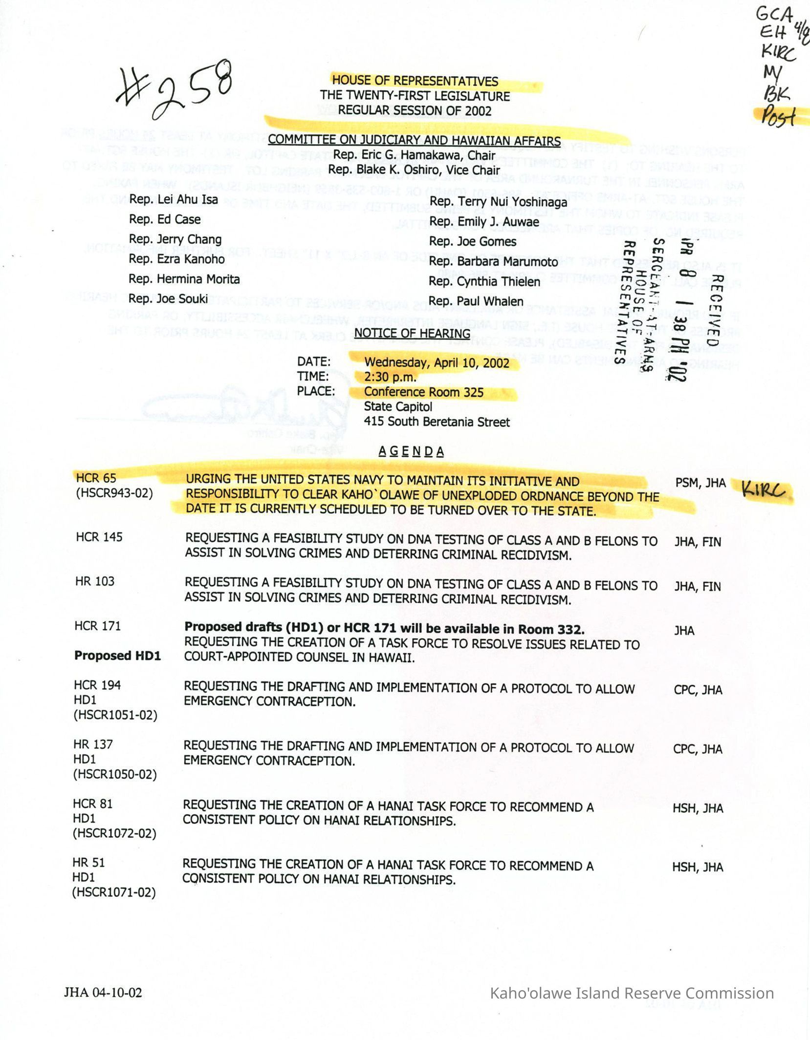 Copy of House of Representatives, The Twenty-First Legislature, Regular Session of 2002, Committee on Judiciary and Hawaiian Affairs, Notice of Hearing, for Wednesday, April 10, 2002. Two copied letter size pages (back to back) with pink slip taped to back page.Creator
