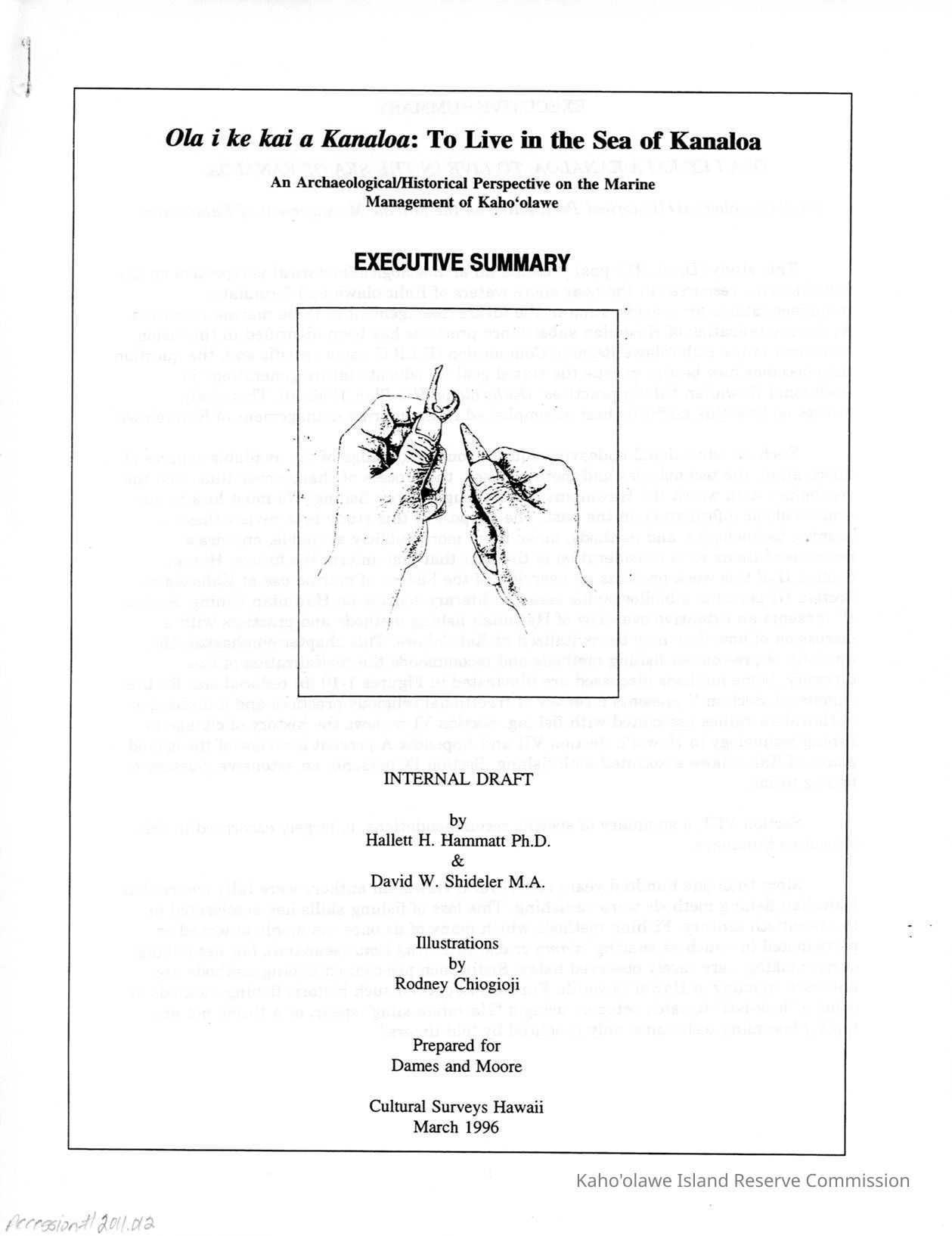 Copy of an internal draft of Ola I ke kai a Kanaloa; To Live in the Sea of Kanaloa. An Archaeological/Historical Perspective on the Marine Management of Kaho'olawe. Executive Summary. 11 black and white copied pages (6 pages copied back to back).Creator